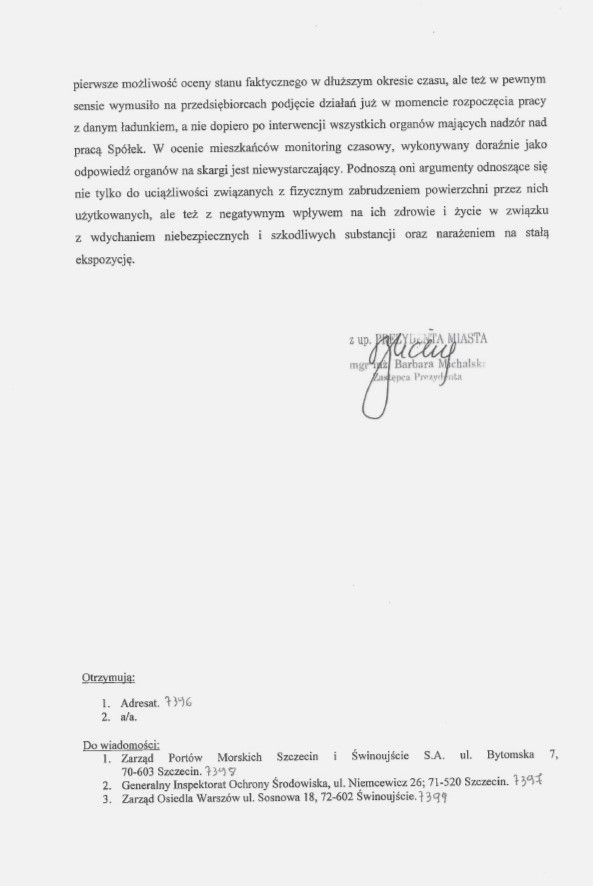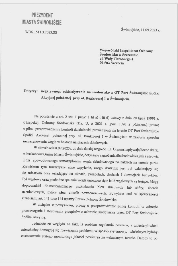 W związku z licznymi sygnałami o kolejnych samozapłonach węgla i związanych z tym zapyleniem powietrza, w poniedziałek 11 września 2023r. prezydent Janusz Żmurkiewicz wystąpił z pismem do Wojewódzkiego Inspektoratu Ochrony Środowiska w Szczecinie.