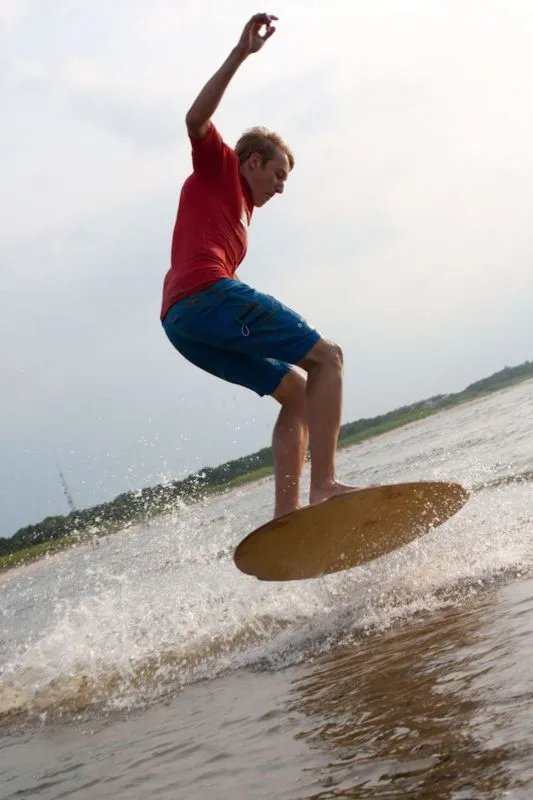 gdy odpowiednia fala zbliża się, skimboarder biegnie w stronę wody. Następnie rzuca deskę na płytką warstwę wody pozostającą po cofającej się fali lub na głębszą wodę naprzeciw fali. Potem wskakuje na deskę obiema nogami i ślizga się, starając utrzymać