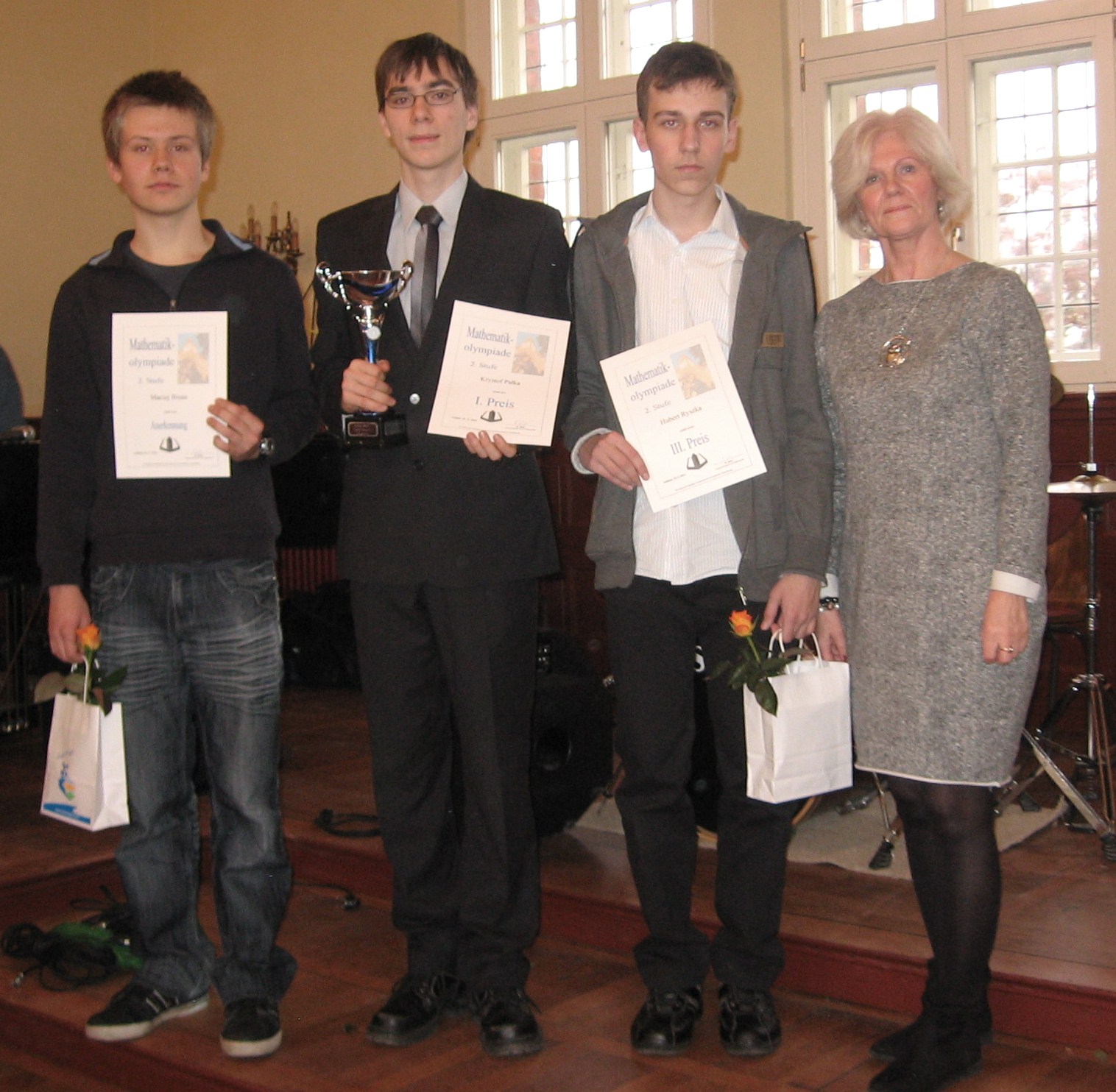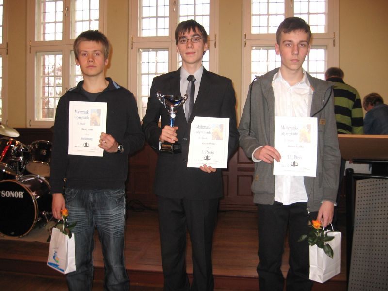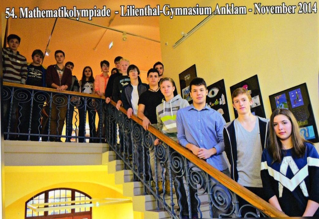 12 listopada 2014 roku odbyła się Olimpiada Matematyczna w niemieckim Anklam, w której wzięło udział 209 uczniów, w tym 10 z Liceum ogólnokształcącego im Mieszka I w Świnoujściu. Wczoraj, tj. 25 listopada 2014 r. na uroczystości ogłoszenia wyników gratulacje i puchar za najwyższy wynik (40 pkt. na 40 możliwych) odebrał Krzysztof Pałka z kl. II B, III miejsce uzyskał Hubert Ryszka z kl. II A, a wyróżnienie otrzymał Maciej Bizan z kl. III A.