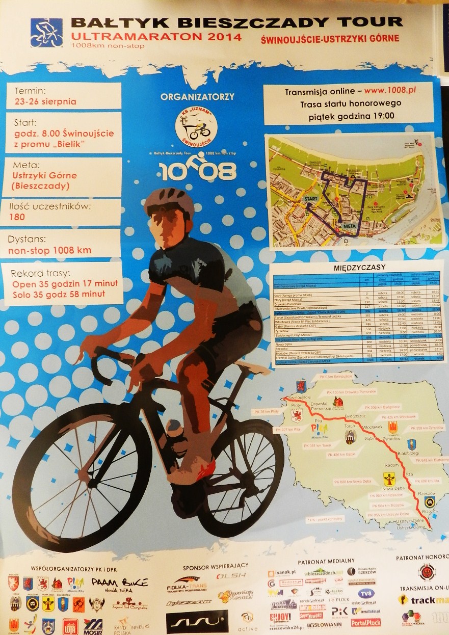 W najbliższą sobotę 23 sierpnia 2014 r. o godz. 8.00 z promu „Bielik” po stronie Warszowa, 180 zawodników wystartuje na trasę morderczego maratonu rowerowego 8. Bałtyk Bieszczady Tour. Wśród odważnych będzie 9 reprezentantów Świnoujścia. Kolarze mają do pokonania 1008 km! Dotychczasowy rekordzista Zdzisław Kalinowski pokonał ją w zaledwie 35 godzin i 58 minut! Świnoujście reprezentować będą: Cezary Dobrochowski, Jan Wesołowski, Waldemar Kwiecień, Stanisław Wieczorek, Ewa Skórka, Bodo Rejmann, Piotr Rębacz, Kamil Chwistecki i Robert Zakens.