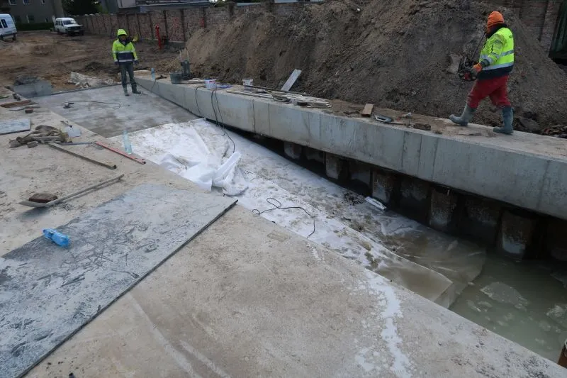 - slip o nachyleniu ok. 12% i szerokości w świetle zjazdu ok. 3,5 m, próg dolny slipu projektuje się na rzędnej - 1,30 m, wnękę slipu planuje się obudować ścianką szczelną stalową z oczepem betonowym, analogiczną do ścianki szczelnej użytej do wykonania projektowanego odcinka nabrzeża, nawierzchnia slipu z betonu zacieranego, antypoślizgowa, na zachodnim oczepie slipu planuje się umieścić reling o wysokości ok. 1,2 m, zaś wschodnim oczepie w odległości co ok. 1,2 m planuje się rozmieścić pionowe, stalowe słupki-uchwyty o wysokości ok. 1,2 m, ułatwiające przemieszczanie się pomiędzy przyczepą pojazdu ze slipowanymi kajakami a oczepem w razie konieczności dostępu do częściowo zanurzonej przyczepy, opisany slip zastąpi zdegradowany istniejący;