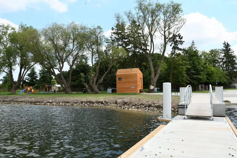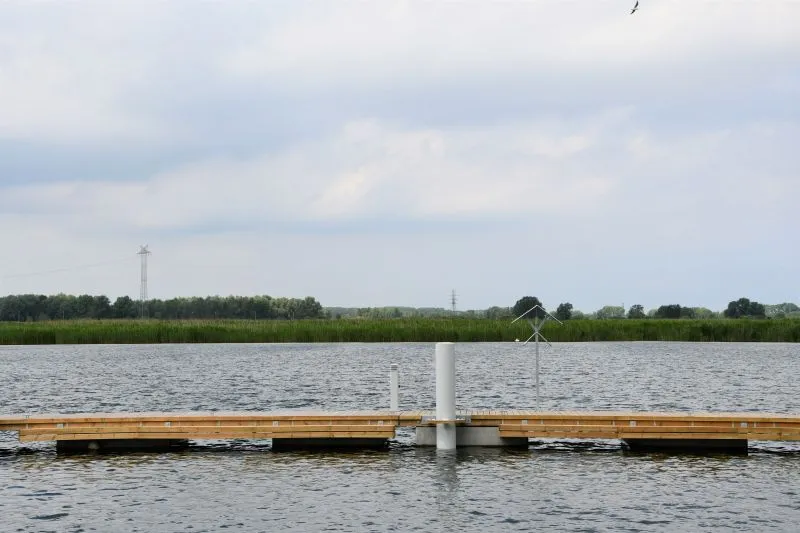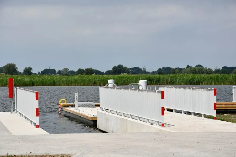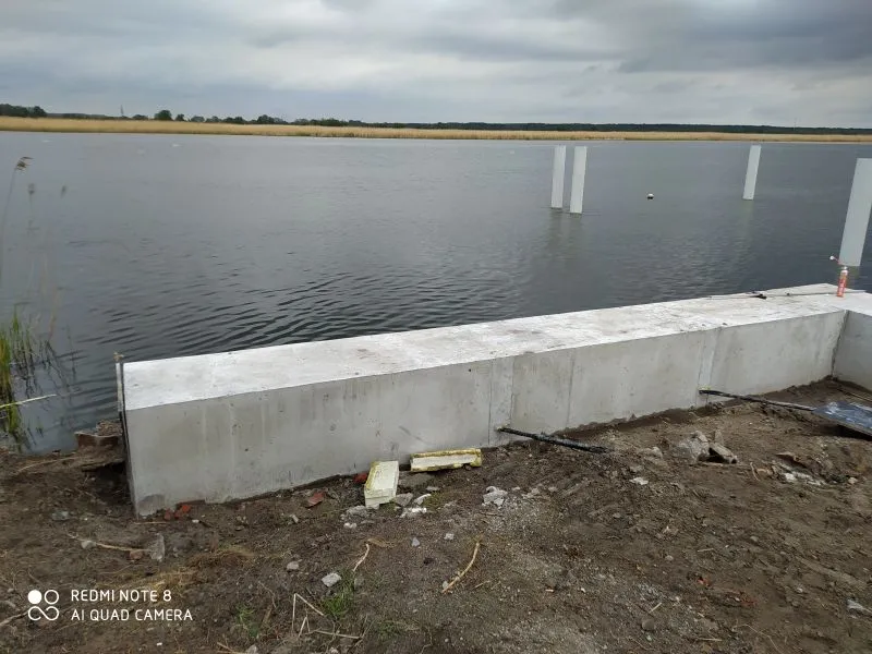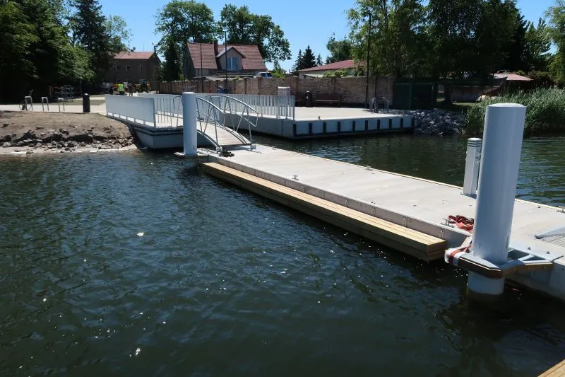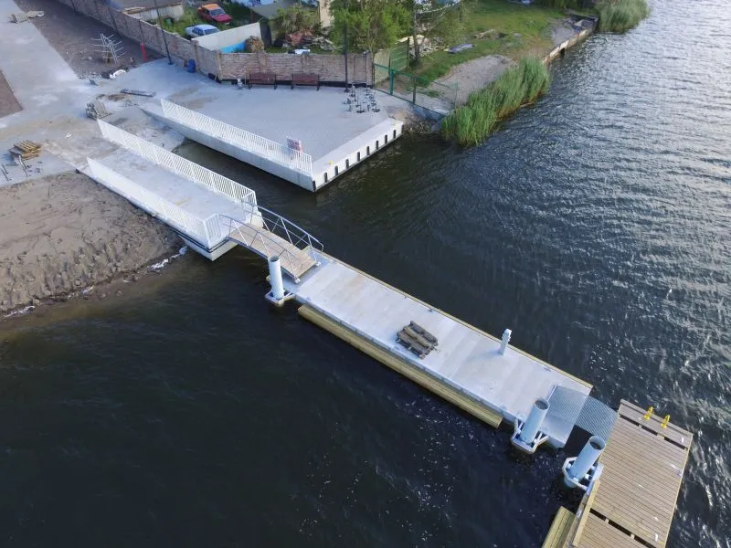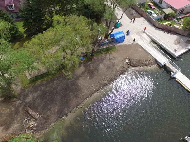 - jako bezpośrednie przedłużenie pomostu zaplanowano pomost cumowniczy wysokoobciążalny o konstrukcji siatkobetonowej, dł. pomostu ok. 15 m x szer. ok. 2,4 m, z obniżeniami dla osób wsiadających/wysiadających z kajaków;