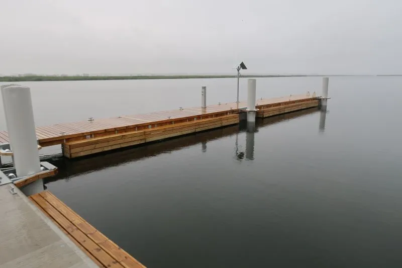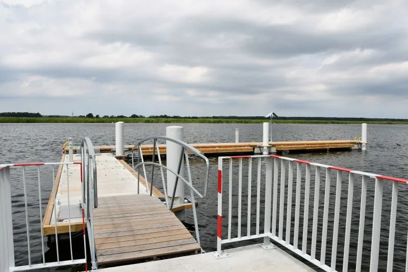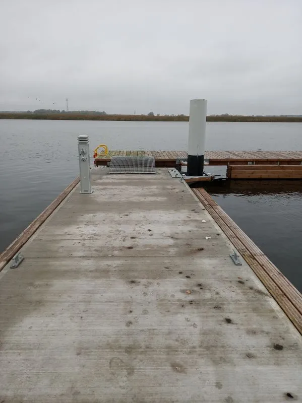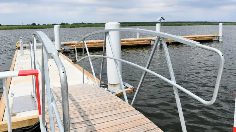 - pomost cumowniczy o konstrukcji drewnianej umieszczony na pływakach siatkobetonowych, pomost ten zaplanowano wykonać jako prostopadły do pomostu omawianego wyżej, długość pomostu ok. 24 m, szerokość ok. 1,8 m, z obniżeniami dla wsiadających/wysiadających z kajaków;