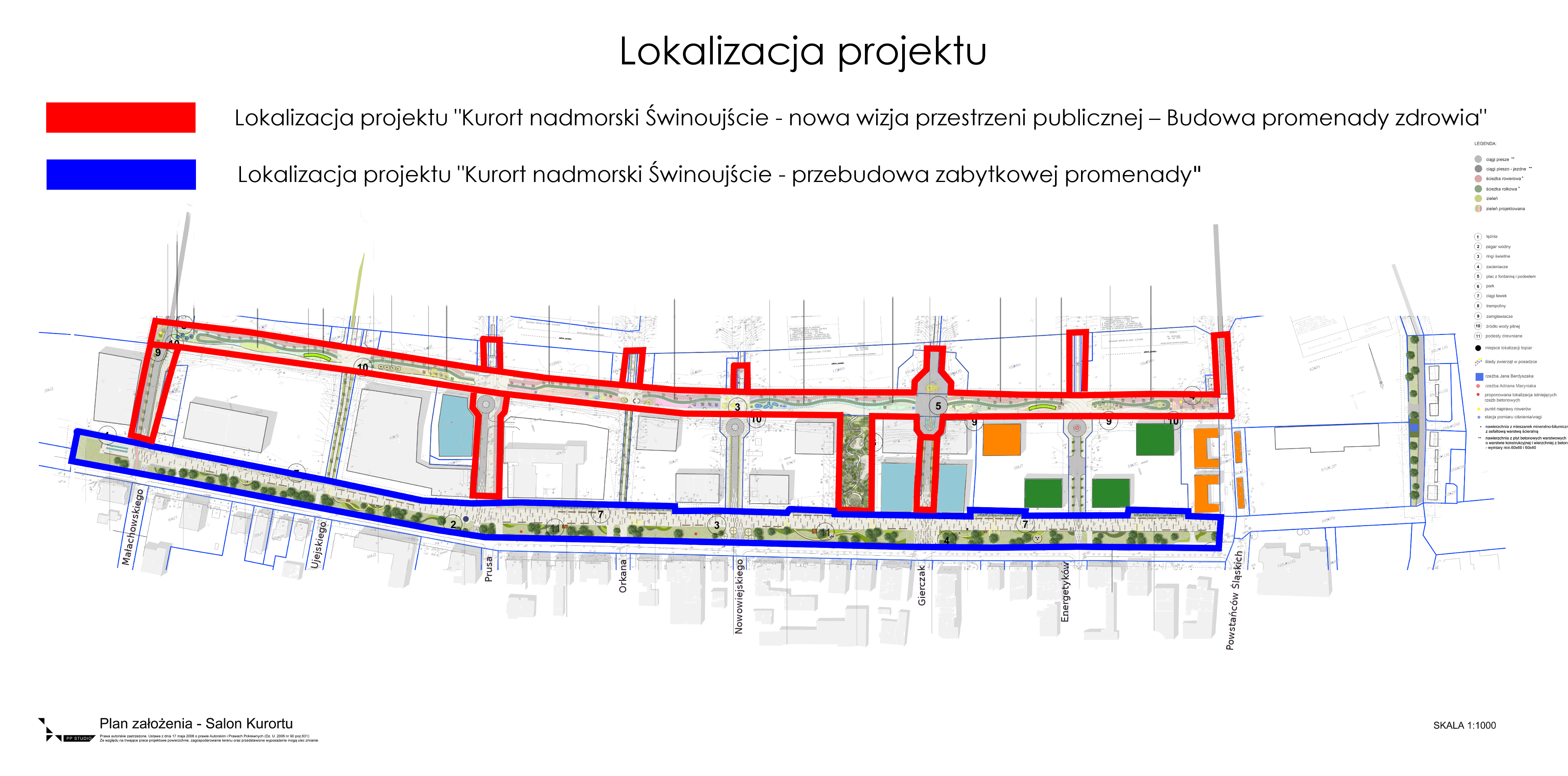 Przedmiotem niniejszego projektu jest przebudowa zabytkowej promenady na odcinku od ul. Małachowskiego do ul. Powstańców Śląskich, o długości ok. 1 km i zmiennej szerokości od 7,70 m do 16 m. Promenada stanowi część Dzielnicy Uzdrowiskowej, która tworzy układ urbanistyczny wraz z historyczną zabudową i zielenią, wpisany do rejestru zabytków decyzją PSOZ/SZ-n/5340/33/91 z 08.03.1991 r. o nr rejestru A1177. Promenada jest najbardziej reprezentacyjną częścią Dzielnicy Nadmorskiej. Zaprojektowany podział przestrzeni odwołuje się do układu historycznego z jasnym podziałem na część spacerową oraz zieleń towarzyszącą. Chcąc podkreślić reprezentacyjną formę przebudowywanej promenady zaplanowano zastosowanie jedynie wysokogatunkowych materiałów oraz nienachalnej formy małej architektury, które powodują że przestrzeń pozostanie atrakcyjna na przestrzeni lat. Zaprojektowano przebudowę ciągu spacerowego starej promenady wraz z towarzyszącym pasem zieleni urządzonej, małą architekturą w postaci ławek i siedzisk miejskich z podnóżkami, zacieniaczami, ringami świetlnymi, urządzeniem wodnym w postaci zegara, tężniami oraz topiarami. Ciąg spacerowy tzw. starej (zabytkowej) promenady wyposażony zostanie w następujące elementy zagospodarowania, w tym formy małej architektury: Zindywidualizowane ławki. Ławki o żeliwnej konstrukcji ustawione całymi ciągami wzdłuż promenady. Dzięki indywidualnie zaprojektowanym elementom wyposażenia możliwe będzie wykorzystanie tradycyjnych materiałów i technologii, takich jak odlewy żeliwne. Przewidziano ławki proste o podniesionym oparciu, ławki z podnóżkami, ławki ze stolikami oraz siedziska bez oparcia. Nowoczesne oświetlenie miejskie. Zaplanowano montaż współczesnych lamp masztowych (pojedynczych i podwójnych) ustawionych wzdłuż całej zabytkowej promenady, uzupełniony o posadzkowe listwy świetlne zlokalizowane tak aby wskazywały co atrakcyjniejsze elementy zieleni. Zacieniacze. To zaprojektowane okrągłe zadaszenia wsparte centralnie na pojedynczych słupach o następujących rozpiętościach i wysokościach: o śr. 6 m i wys. 5,63 m, o śr. 5m i wys. 4,70m, o śr. 4m i wys. 3,75m. Ringi świetlne. Budujące przyjazną przestrzeń wieczorem i nocą oraz będące formą dużej rzeźby ulicznej. Ringi (8 szt.) to zbliżone wielkością do zacieniaczy stalowe kręgi wyposażone w listwy świetlne rozpostarte na osiowo umiejscowionym słupie. W projekcie przewidziano możliwość sterowania kolorem oświetlenia, tak aby dodatkowo móc kreować nastrój w ciągu promenady. Zaprojektowano ringi świetlne trzech typów: o śr. 6 m, 5 m i 4 m. Fontanna - zegar wodny. Zegar wodny został zaprojektowany jako urządzenie wolnostojące, pełniące funkcje związane z rekreacją i turystyką. Podstawowymi zadaniami obiektu jest odmierzanie i wskazywanie czasu, poprawa komfortu cieplnego użytkowników w okresie letnim, oraz podwyższanie walorów estetycznych przestrzeni. Projektowany zegar wodny będzie ważnym punktem dopełniającym założenie promenady, charakterystycznym elementem, który wraz z innymi urządzeniami i obiektami stanie się „wizytówką” promenady. Tężnia. Zaplanowana na zamknięciu osi historycznego ciągu promenady, przedłużonej do wysokości ulicy Małachowskiego. Będzie to zespół dwóch tężni solankowych (1 tężnia dwuelementowa). Tężnia będzie pełnić funkcję rekreacyjną, leczniczą oraz turystyczną. Walorem jest tworzący się w jej otoczeniu mikroklimat, sprzyjający profilaktyce i leczeniu m.in. górnych dróg oddechowych. Przepływ solanki odbywać się w układzie zamkniętym. Solanka o odpowiednim stężeniu pompowana będzie ze zbiornika do koryt systemowych tężni (umieszczonych bezpośrednio pod konstrukcją dachu), następnie spływać będzie w dół po gałązkach tarniny i poprzez korytka ściekowe trafiać znów do zbiornika. Projekt zakłada konieczność monitorowania stężenia solanki w zbiorniku, gdyż na skutek wysokich temperatur lub obfitych opadów deszczu stężenie może ulec zmianie. Solanka używana w ramach działania tężni powinna posiadać odpowiednie stężenie (4-7%) oraz mieć atest PZH określający jej właściwości w aspekcie wykorzystania do celów leczniczych lub uzdrowiskowych. Projektowany obiekt to zespół dwóch tężni solankowych, wykonanych w konstrukcji drewnianej opartych na wspólnej płycie fundamentowej. W bezpośrednim sąsiedztwie tężni zaprojektowano zespoły ławek umożliwiające odpoczynek. Szerokość przejść wzdłuż elementów tężni uwzględnia potrzeby osób poruszających się na wózkach inwalidzkich, natomiast przestrzenie pomiędzy ławkami umożliwiają swobodne ustawienie wózka, nie blokując przy tym ścieżki ruchu. Symboliczne wejście w strefę tężni wyposażone zostanie w regulamin określający zasady korzystania z obiektu. Podesty ekspozycyjne. Wzdłuż promenady historycznej, na połączeniu ciągu pieszego i pasa zieleni zaprojektowano 4 podesty artystyczne/ekspozycyjne (o pow. ok. 6 -16 m2.) pełniące funkcję mini scen. Wszystkie podesty to drewniane wyniesienia ponad teren chodnika, zaopatrzone w źródło zasilania. Stojaki rowerowe. Zaplanowano posadowienie 19 szt. stojaków rowerowych systemowych. Tabliczki z nazwami ulic w posadzce. Na przedłużeniu ulic stanowiących dowiązanie do istniejącej siatki miejskiej wprowadzono dekoracyjne tabliczki z nazwami ulic (7 szt.) rezygnując tym samym z pionowych oznaczeń w ciągu promenady historycznej. Topiary. Wzdłuż promenady zaplanowano zimozielone topiary (25 szt.) przedstawiające zarówno nawiązujące do historii sylwetki ludzkie oraz sylwetki zwierząt. Całość założenia ciągu historycznego zostanie uzupełniona zielenią. Zakończenie realizacji projektu nastąpiło w czerwcu 2020 r.