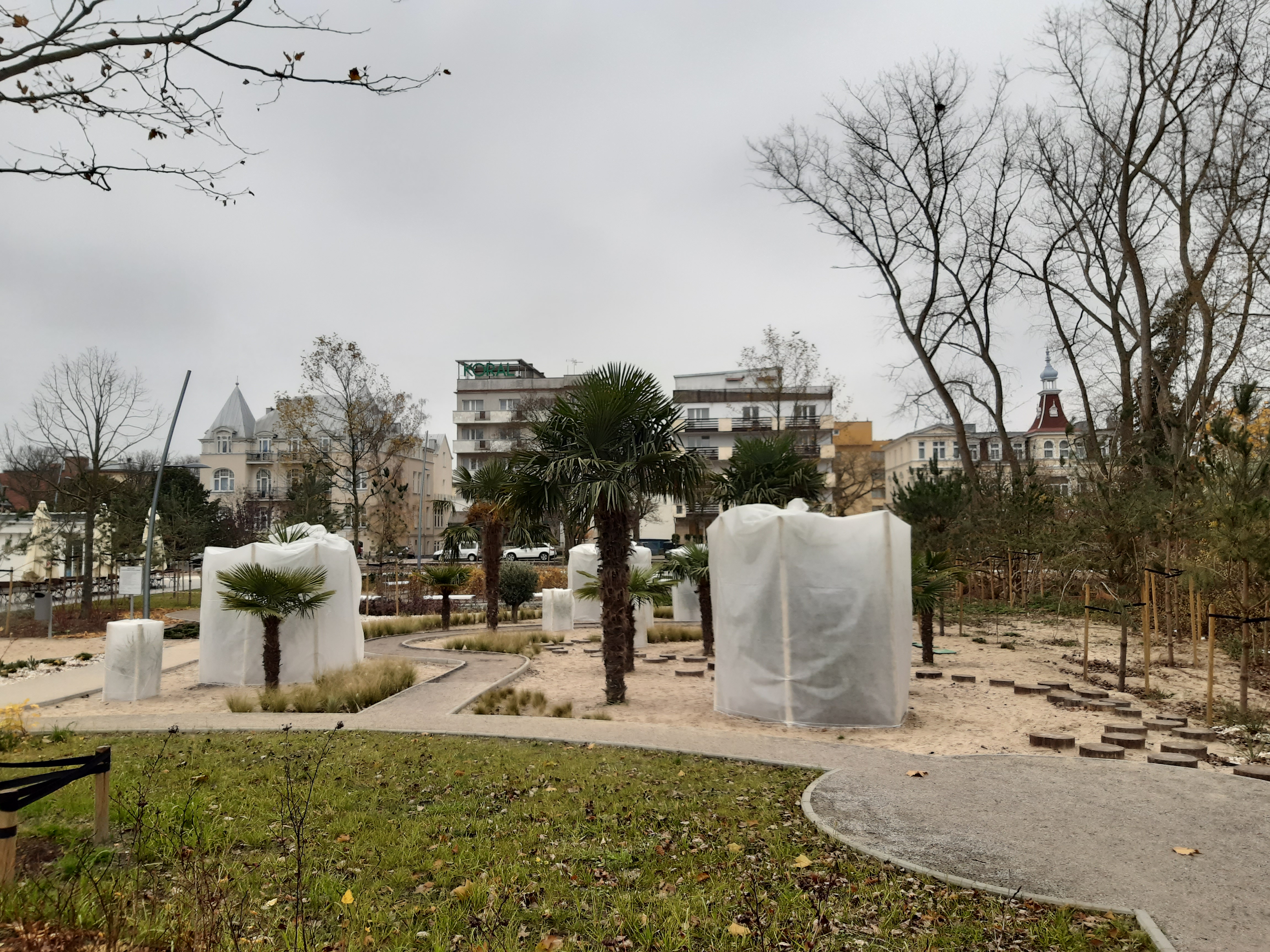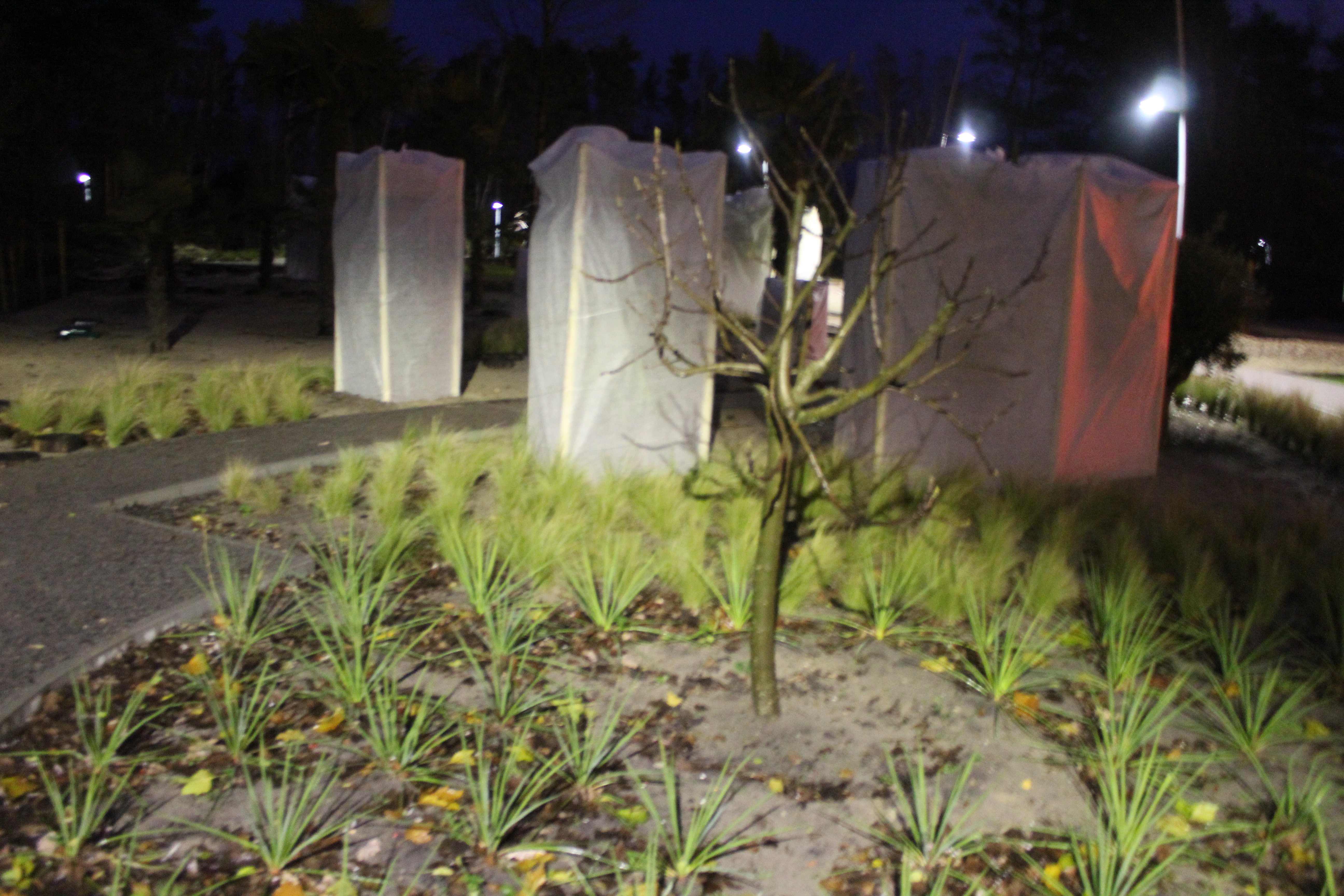 Do czasu wybudowania namiotów Małgorzata Gawrońska, która obsadzała ogród i zajmuje się jego pielęgnacją zabezpieczyła część roślin specjalną włókniną, która chroni drzewa i krzewy przed mrozami.