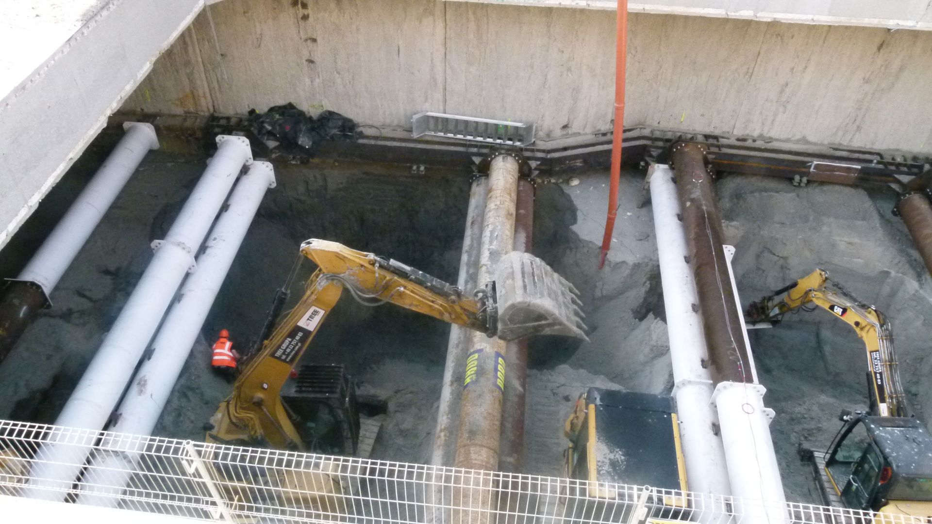 W segmentach od drugiego do szóstego zaczęło się wykonywanie rozpór żelbetowych stałych. Kontynuowane są tam prace przy wieńcu ścian szczelinowych. Budowano też studnie dla odwodnienia wykopu.