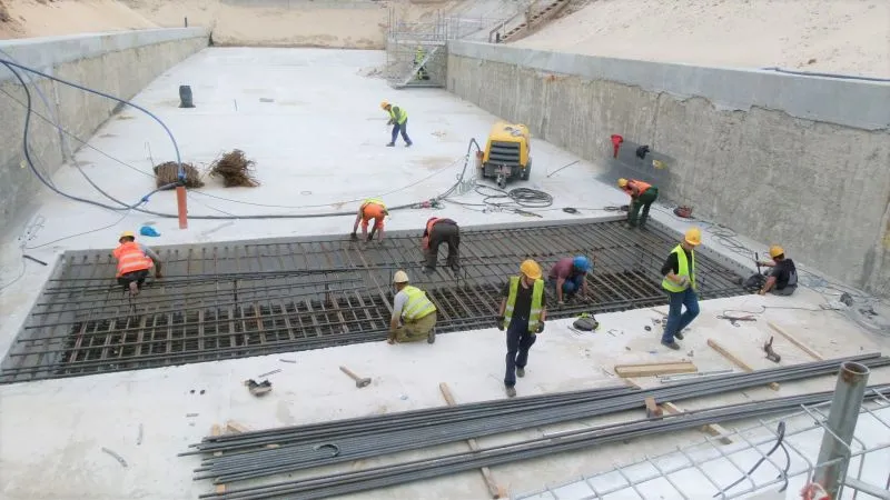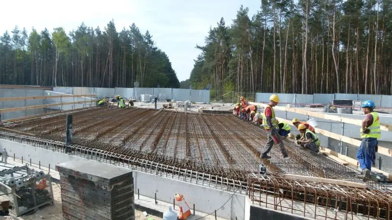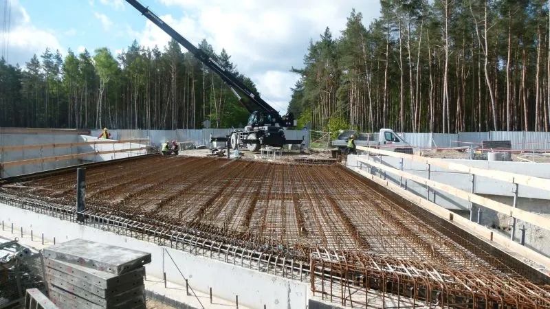 W zakładzie prefabrykacji trwa produkcja segmentów obudowy tunelu, które są następnie przewożone na plac magazynowy, a w odpowiednim czasie w rejon komory startowej.