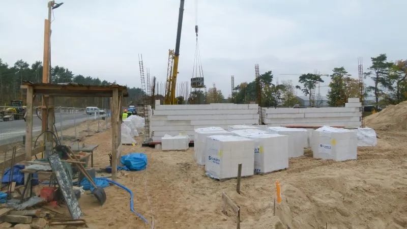 Trwa również murowanie ścian zewnętrznych w budynkach biura Centrum Obsługi. Przy trafostacji TK3 kontynuowane są roboty fundamentowe oraz przygotowywane jest podłoże i wykonywana jest warstwa betonu podłoża wewnątrz budynku.