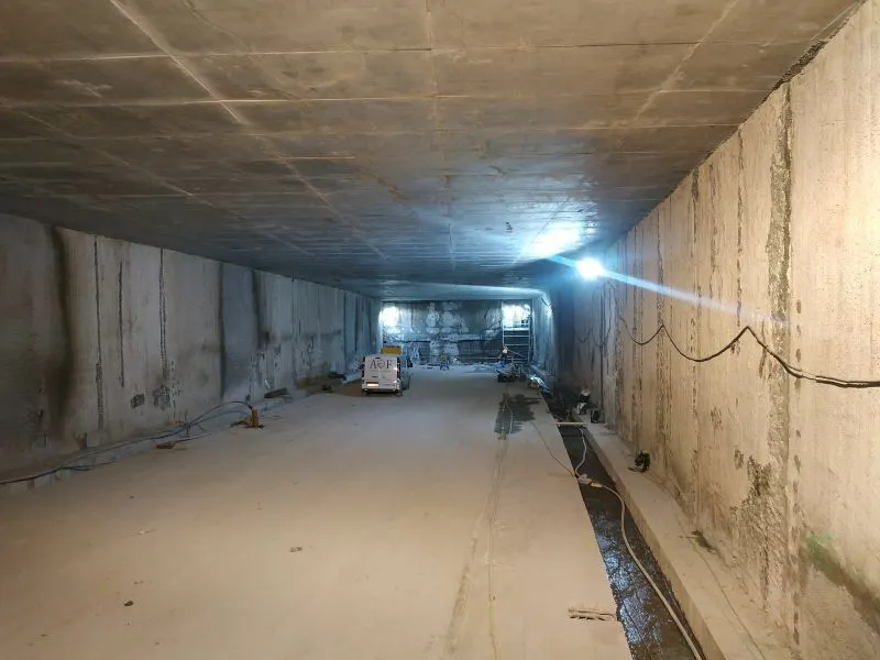 Zakończono budowę pomostów na konstrukcji wzmacniającej obudowę tunelu w miejscu planowanych wyjść ewakuacyjnych wraz z rampami najazdowymi. Rozpoczęto natomiast prace związane z wierceniem otworów pod lance mrożeniowe na obu wyjściach ewakuacyjnych, które będą wykonywane w technologii mrożenia gruntu.