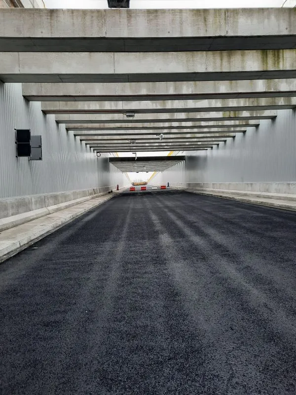 W tunelu TBM wykonywane są najważniejsze prace montażowe oraz uszczelnianie całej konstrukcji, w tym wyjść ewakuacyjnych. Odbyły się również testy znaków zmiennej treści, które zostały zamontowane w tunelu. Jego obudowa jest czyszczona, podobnie jak jezdnia, aby rozpocząć układanie warstwy ścieralnej.