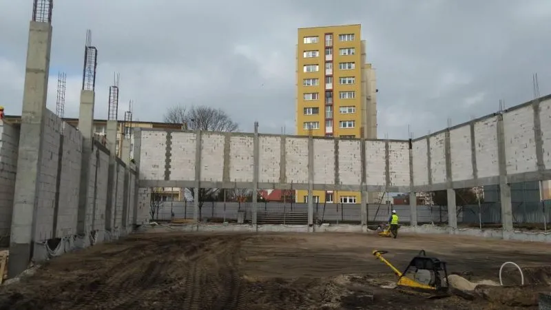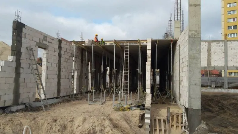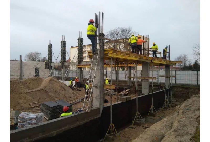 W przyszłej sali sportowej powstały słupy wyznaczające ściany zewnętrzne. Murowano także fundamenty tego obiektu.