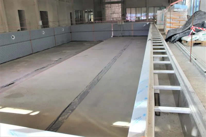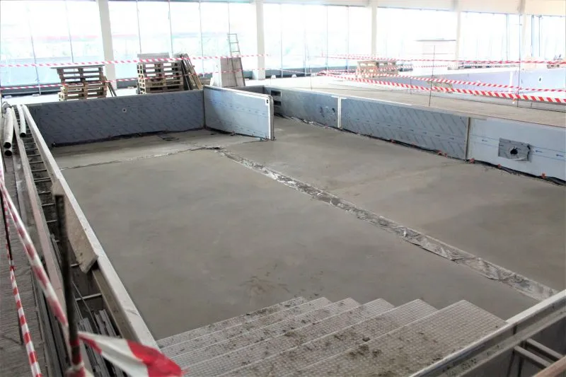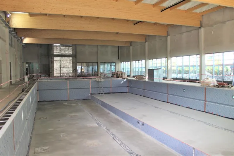 Wewnątrz są już wybudowane w stanie surowym niecki obu basenów. 25-metrowy będzie miał ruchome dno. Obok jest mniejszy basen rekreacyjny, do którego wchodzić się będzie schodkami.