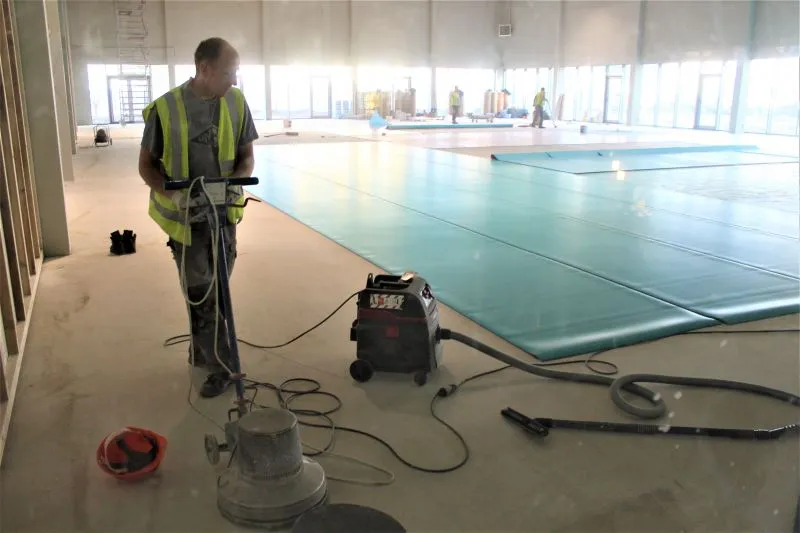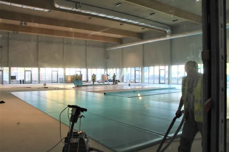 Operacja układania (wyklejania) wykładziny w hali sportowej odbywa się wręcz w sterylnych warunkach. Drzwi zewnętrzne są pozamykane, betonowa nawierzchnia dokładnie szlifowana i oczyszczana z pyłu. Dopiero na tak przygotowaną podłogę układana jest nawierzchnia boiska.