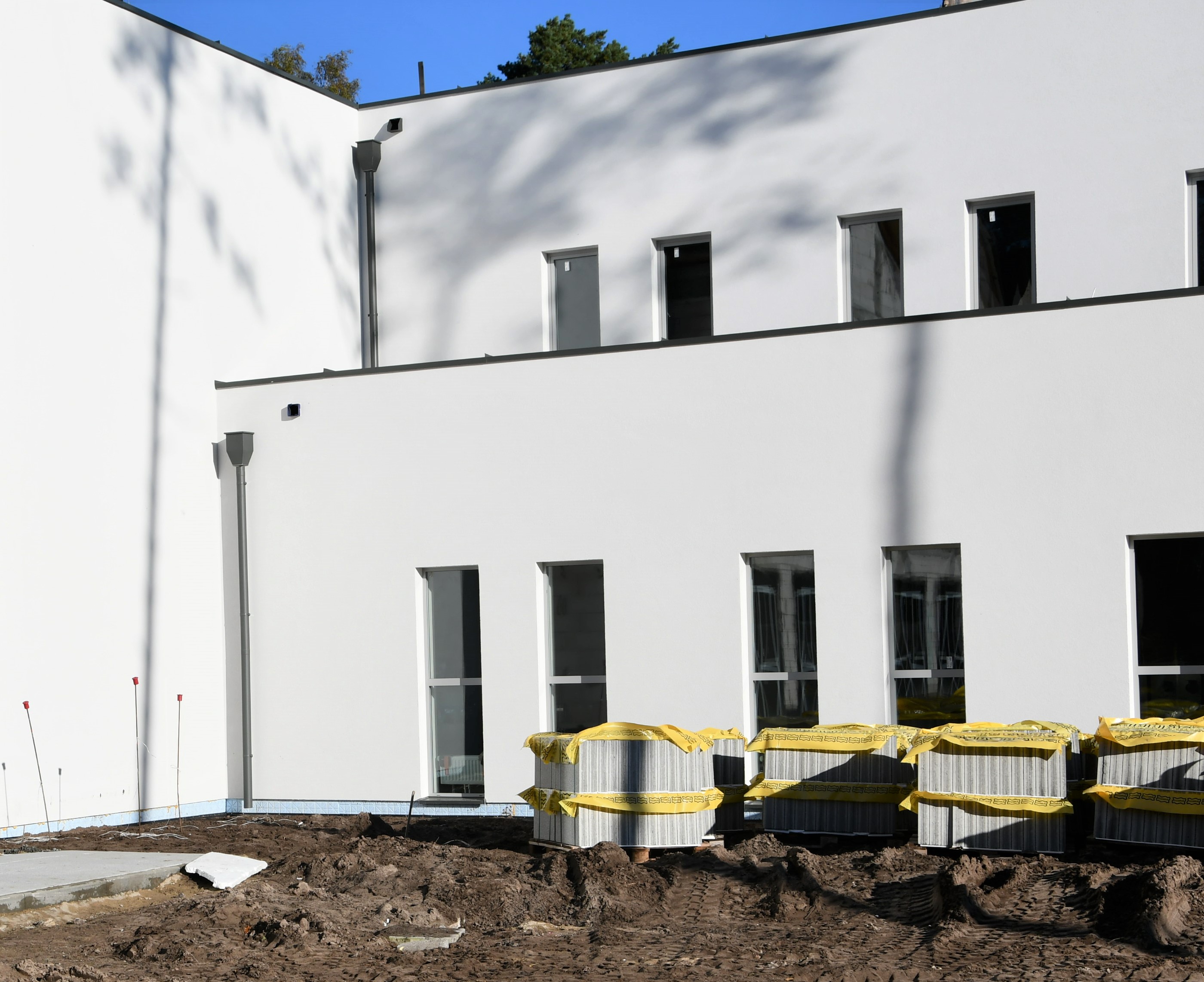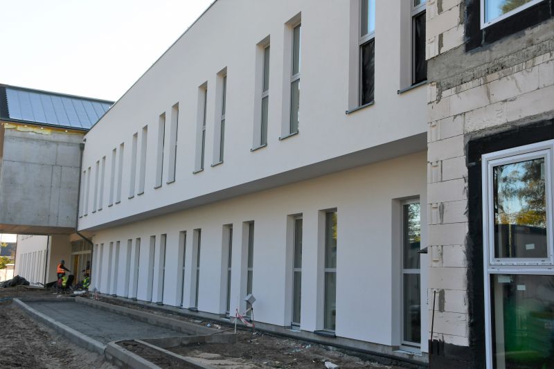 Zakończono już roboty murowe i żelbetowe budynku, wykonano posadzki oraz tynki wewnętrzne i dachy płaskie. W tym miesiącu wykonawca prowadził prace m.in. przy: