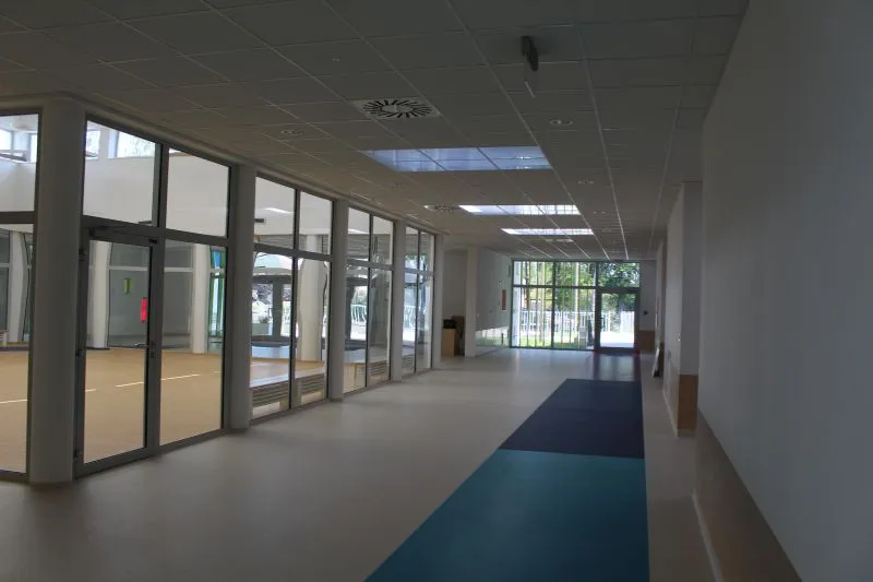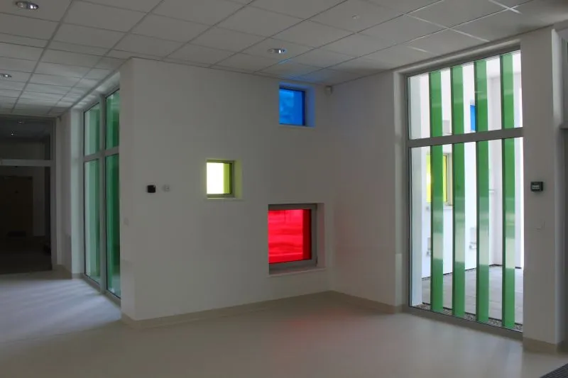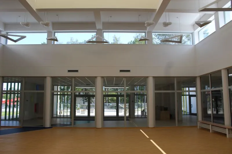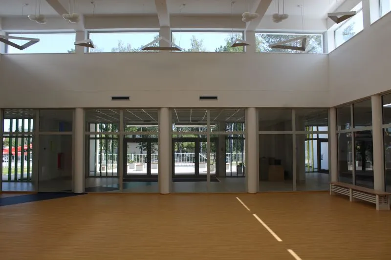 Przedszkole imponuje przede wszystkim przestronnością zarówno sal dla poszczególnych grup, jak i głównej sali zabaw czy sali gimnastycznej. W budynku jest dużo naturalnego światła wpadającego dzięki przeszklonym ścianom i dużemu świetlikowi umieszczonemu w centralnej części obiektu. Do tego wnętrza są bardzo kolorowe.