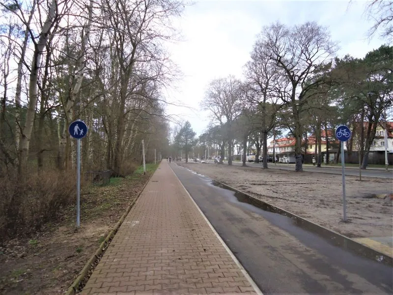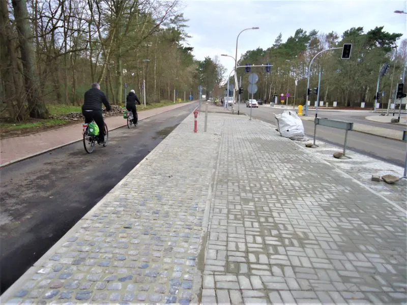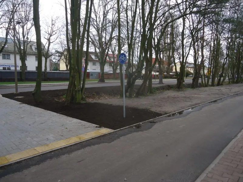 Powstała nowa ścieżka rowerowa (w sąsiedztwie dotychczasowej, z czerwonego polbruku, która teraz będzie ścieżką dla pieszych). Na ścieżce rowerowej brakuje jednak jeszcze ostatniej warstwy nawierzchni, dlatego po opadach tworzą się tutaj kałuże. Gdy zostanie ona wyłożona ostatnią warstwą, woda będzie spływała poza ścieżkę.
