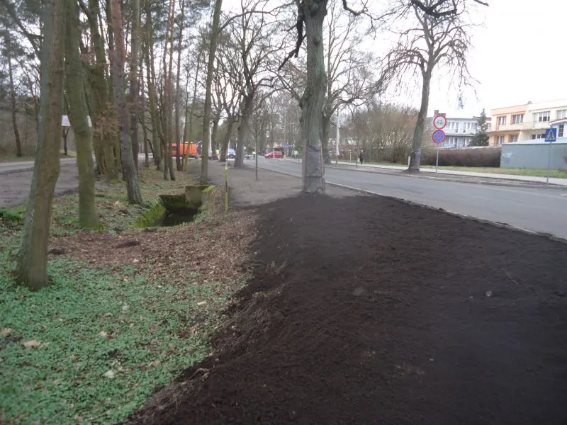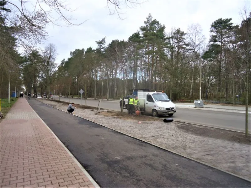 Właśnie zakończono nasadzenia prawie 80 nowych drzew. na obszarze oddzielającym jezdnię od ścieżki rowerowej i chodnika wysypywana jest warstwa czarnoziemu pod nowe nasadzenia.
