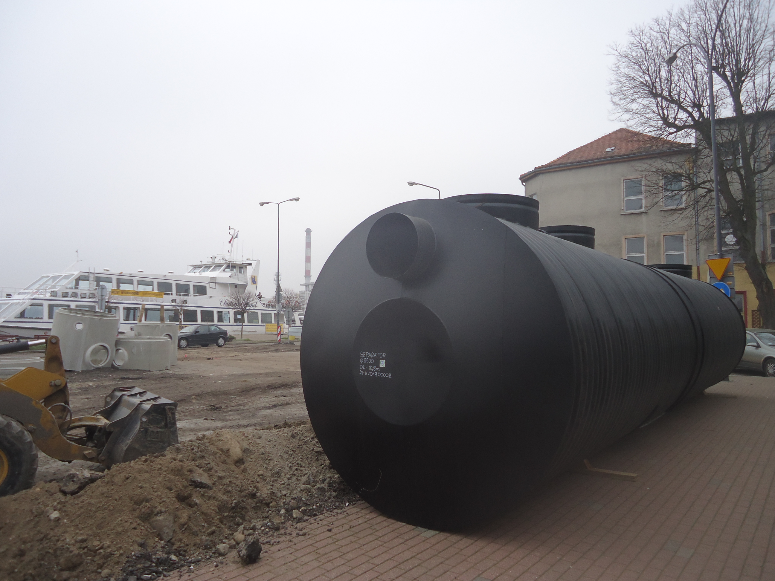 To potężny, czarny, metalowy zbiornik o średnicy 2,5 metra i długości 10,8 m. W celu umieszczenia go w ziemi potrzebny będzie wykop o znacznie większej powierzchni, choć już nie tak głęboki, jak w przypadku pompowni. W separatorze będzie oddzielana woda czysta od zanieczyszczonej i dalej poprzez pompownię ta czysta zostanie wypompowana na zewnątrz (do kanału).