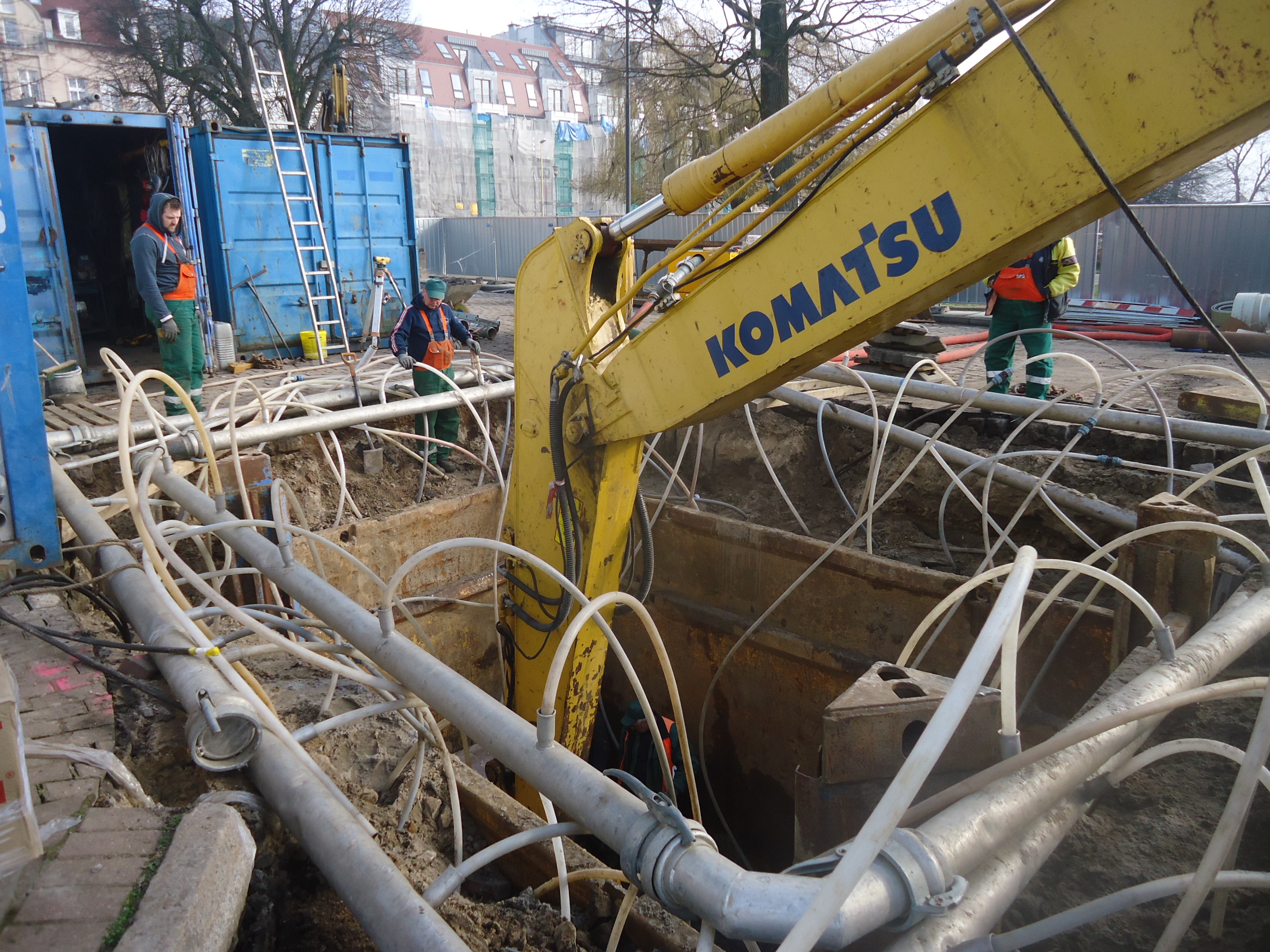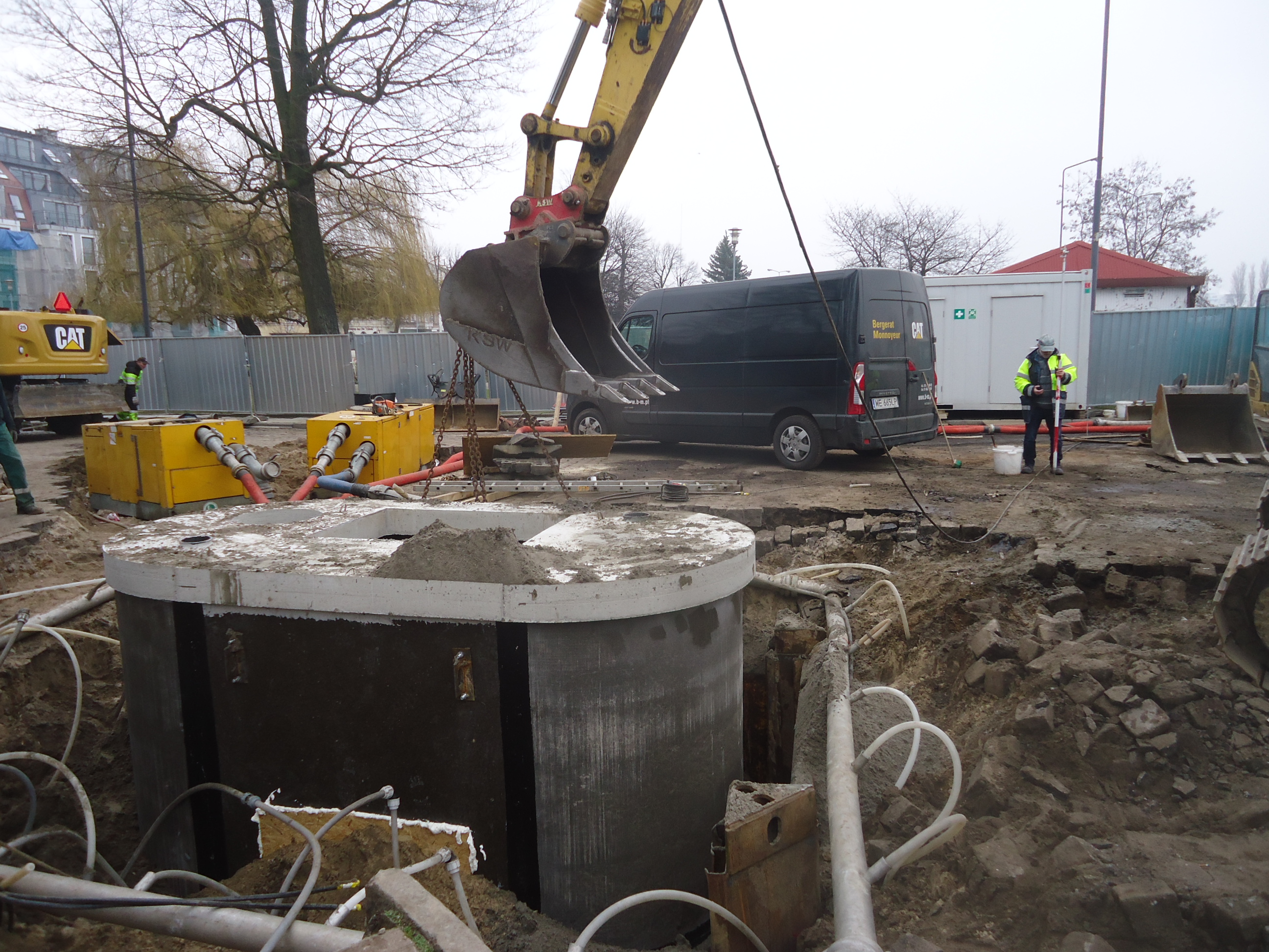 Woda pojawiła się już na głębokości metra, a wykop pod instalację i płytę, na której została posadowiona musiał mieć ponad 6 m głębokości. Prace zostały wykonane w ciągu dwóch dni i już w czwartek 28 lutego pompownia została zamontowana i można było usuwać ścianki szczelne.