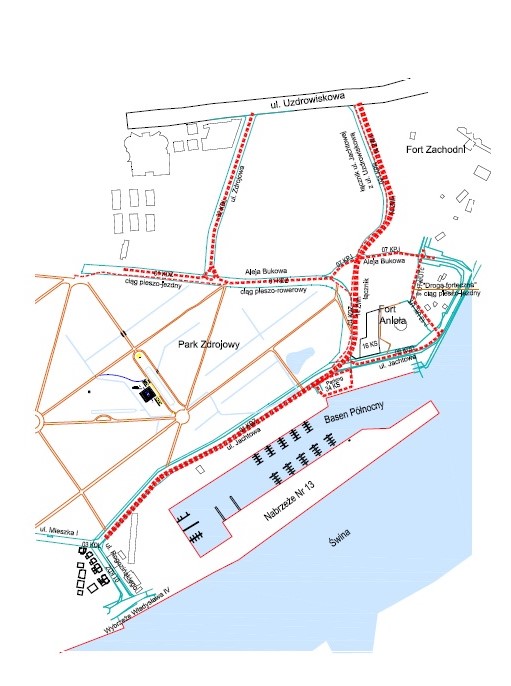 Na dalszym odcinku ścieżka i chodnik będą odchodziły w prawo i prowadziła wzdłuż tzw. alei bukowej (równolegle do ulicy Uzdrowiskowej. Natomiast sama ulica Nowojachtowa (także z chodnikiem) będzie biegła prostopadle do ulicy Uzdrowiskowej.