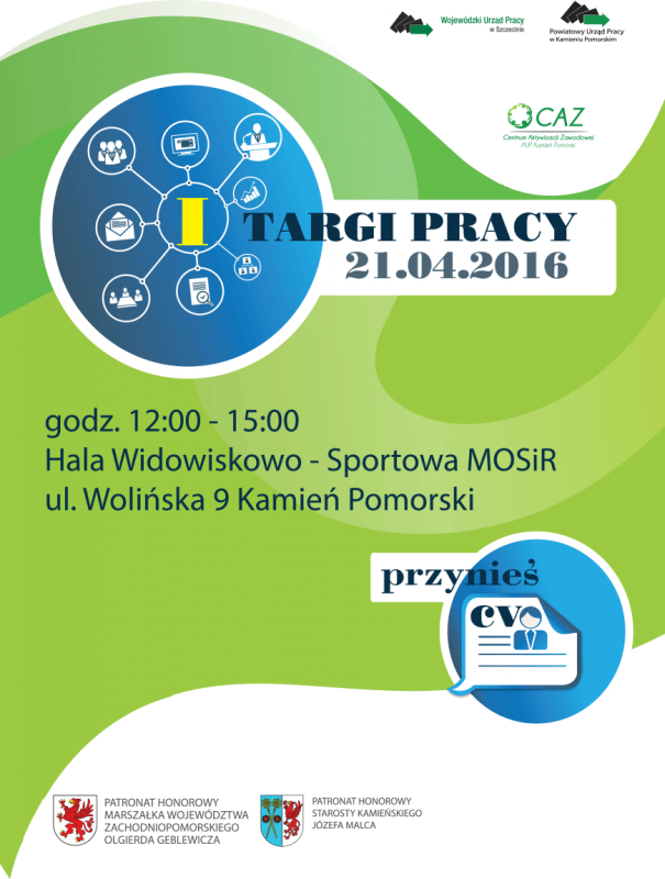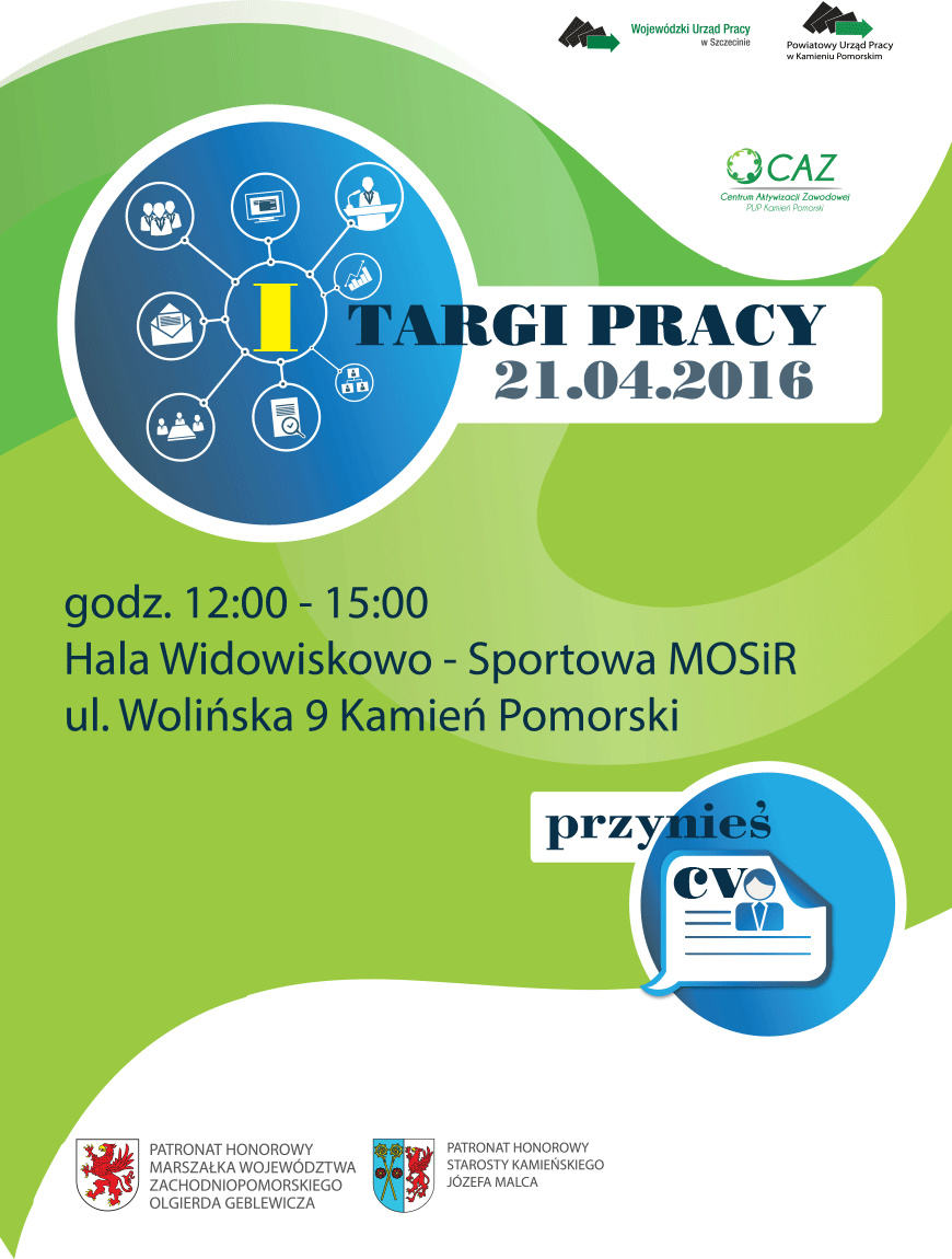 Centrum Aktywizacji Zawodowej w Świnoujściu informuje, że w dniu 21.04.2016r. w godzinach od 12.00 do 15.00 w Hali Miejskiego Ośrodka Sportu i Rekreacji w Kamieniu Pomorskim odbędą się I Targi Pracy. Zapraszamy wszystkie chętne osoby bezrobotne oraz pracodawców zainteresowanych uczestnictwem w Targach. Zgłoszenia przyjmujemy telefonicznie pod numerem tel.: 91-321-97-51, pocztą elektroniczną:sekretariat@pup.swinoujscie.pl lub osobiście. Na zgłoszenia czekamy do dnia 11.04.2016r.