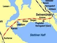 W dniu 16 marca 1863 roku otwarto połączenie kolejowe Berlin-Pasewalk-Züssow-Stralsund. Późniejsze działania kupców z wyspy Uznam doprowadziły do tego, że 11 grudnia 1874 roku Berlińsko-Szczecińskie Towarzystwo Kolejowe (niem. Berlin-Stettiner Eisenbahn-Gesellschaft) uzyskało koncesję na budowę odnogi tej linii do Świnoujścia. Już na początku 1875 roku rozpoczęto pierwsze prace budowlane. Linia miała początek w Ducherow, dalej wiodła przez most podnoszony "Karniner Hubbrücke" na Peenestrom, następnie przez południową część wyspy Uznam i od południowo zachodniej strony docierała do Świnoujścia do stacji Swinemünde Hbf . Linię oddano do eksploatacji 15 maja 1876, była to linia jednotorowa o długości 37,67 km. W 1892 roku wprowadzono letnie połączenie pośpieszne z Berlina do Świnoujścia. W 1907 roku zaczęto prace nad budową drugiego toru ;w dniu 23 maja 1908 roku nastąpił jego odbiór techniczny, a 1 lipca tego roku linia stała się oficjalnie linią dwutorową. Jednocześnie zwiększono prędkość maksymalną do 100 km/h; przejazd z Berlina do Świnoujścia zajmował około 2,5 godziny. w dniu 28 kwietnia 1945 wycofujące się wojska niemieckie wysadziły przęsło mostu w Karnin. Po wojnie komendantura radziecka kazała odbudować zniszczoną w czasie wojny linię do Karnin, która potem służyła wojskom radzieckim do wywozu dóbr z wyspy Uznam. W roku 1947 rozpoczęto rozbiórkę linii od Karnin do Świnoujścia; pod koniec 1948 pozostały już tylko puste nasypy oraz budynki stacyjne. W 1948 roku zaczęto rozbierać odcinek od Ducherow do mostu w Karnin, a w latach 1952-53, zdemontowano częściowo most w Karnin.