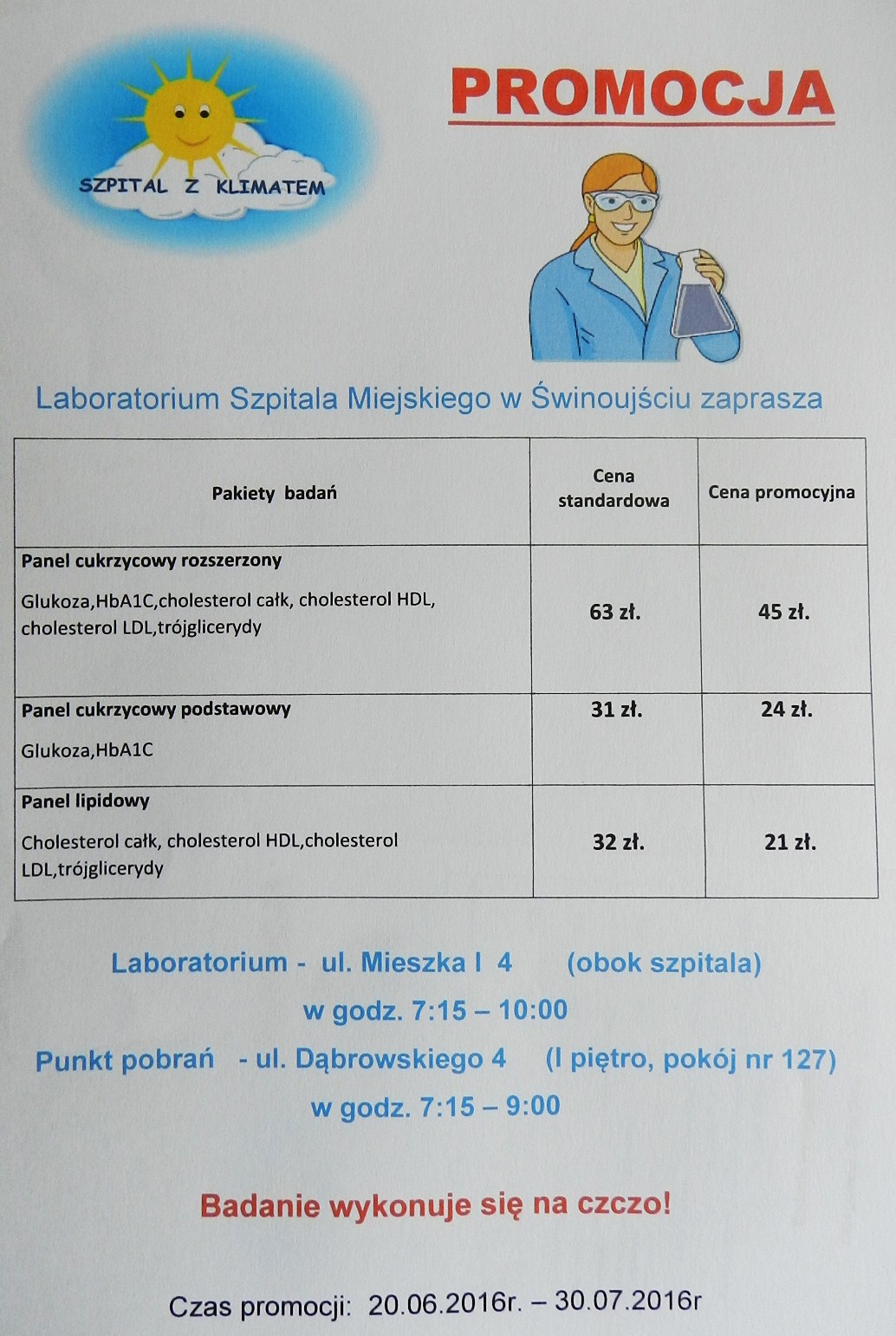 Laboratorium Szpitala Miejskiego im Jana Garduły zaprasza na badania w promocyjnej cenie. Taniej można zrobić: panel cukrzycowy rozszerzony (glukoza, HbA1C, cholesterol całk, cholesterol HDL, cholesterol LDL, trój glicerydy), panel cukrzycowy podstawowy (glukoza, hBA1C) oraz panel lipidowy (cholesterol całk, cholesterol HDL, cholesterol LDL, trój glicerydy). Zobacz szczegóły.