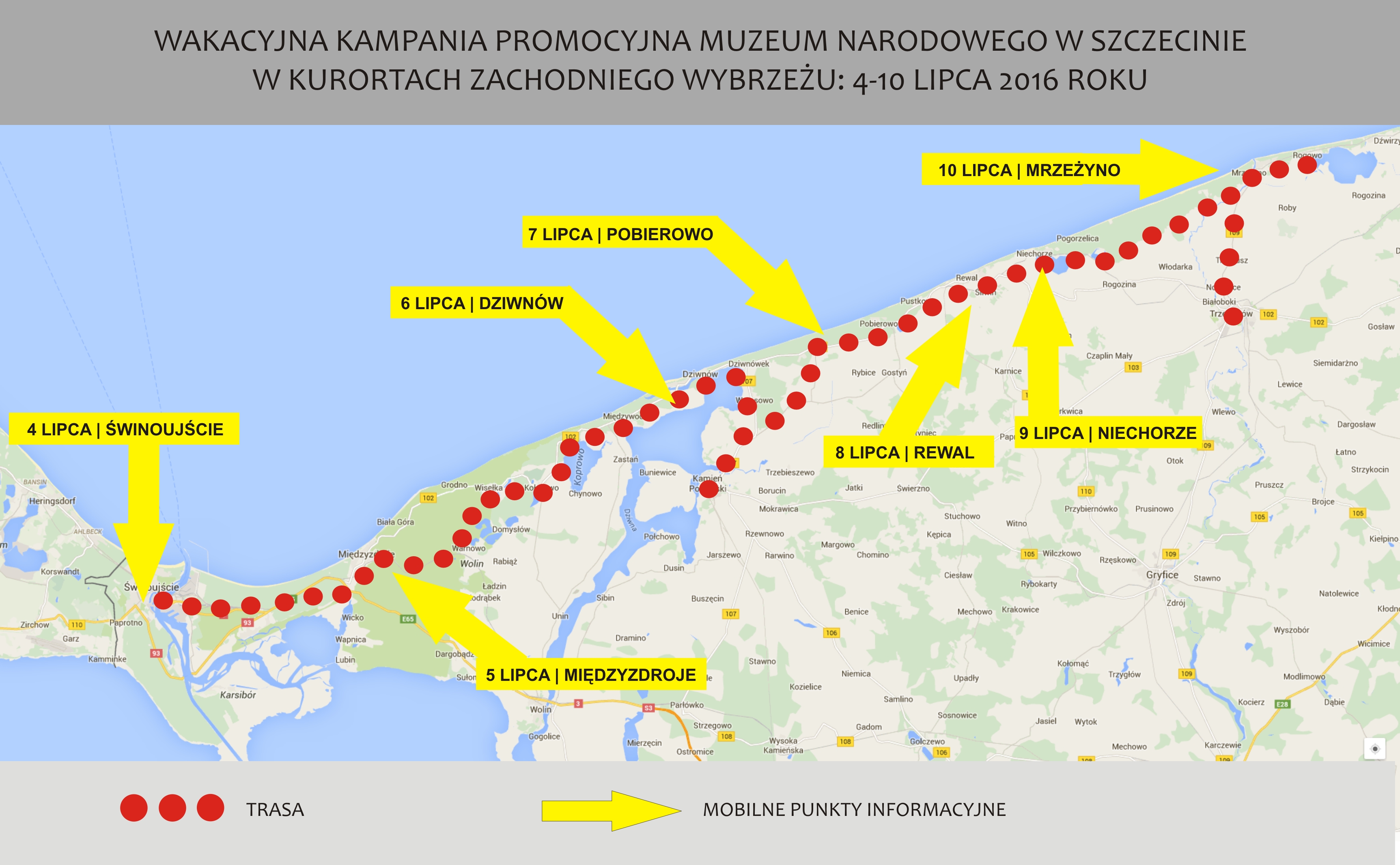 Muzeum Narodowe w Szczecinie, już po raz trzeci, rozpoczyna wakacyjną kampanię promocyjną. Zespół Działu Komunikacji Społecznej MNS przemierzy na rowerach pas zachodniego wybrzeża Bałtyku – częścią Międzynarodowego Szlaku Rowerowego Wokół Bałtyku R10 – od Świnoujścia po Mrzeżyno. W każdym z wczasowisk – w punktach informacji turystycznej, ośrodkach kultury, hotelach, ośrodkach wczasowych i campingach,  kawiarniach, restauracjach oraz komercyjnych atrakcjach – dystrybuowane będą materiały promocyjne MNS. Wieczorami, od godziny 18.00 do 21.00, w  centralnych punktach większych kurortów (harmonogram poniżej) odbywać się będzie także promocja interakcyjna: mobilny, rowerowy punkt informacyjny, w którym pracownicy MNS będą zachęcać do odwiedzenia Muzeum, opowiadać o aktualnych wystawach i wydarzeniach.