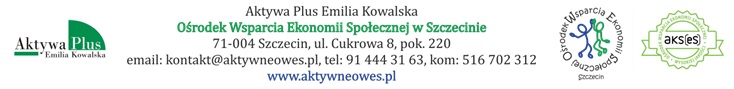 ü pocztą lub osobiście na adres: Aktywa Plus Emilia Kowalska Ośrodek Wsparcia Ekonomii Społecznej ul. Cukrowa 8, pok. 220, 71-004 Szczecin