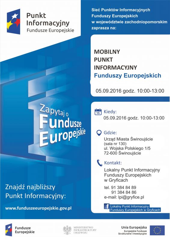 Uprzejmie informujemy, iż mieszkańcy Miasta Świnoujście w dniu 05.09.2016 (poniedziałek), w godzinach 10:00 – 13:00, w Urzędzie Miasta Świnoujście (sala 130 na I piętrze) mogą skorzystać z usług Mobilnego Punktu Informacyjnego Funduszy Europejskich.