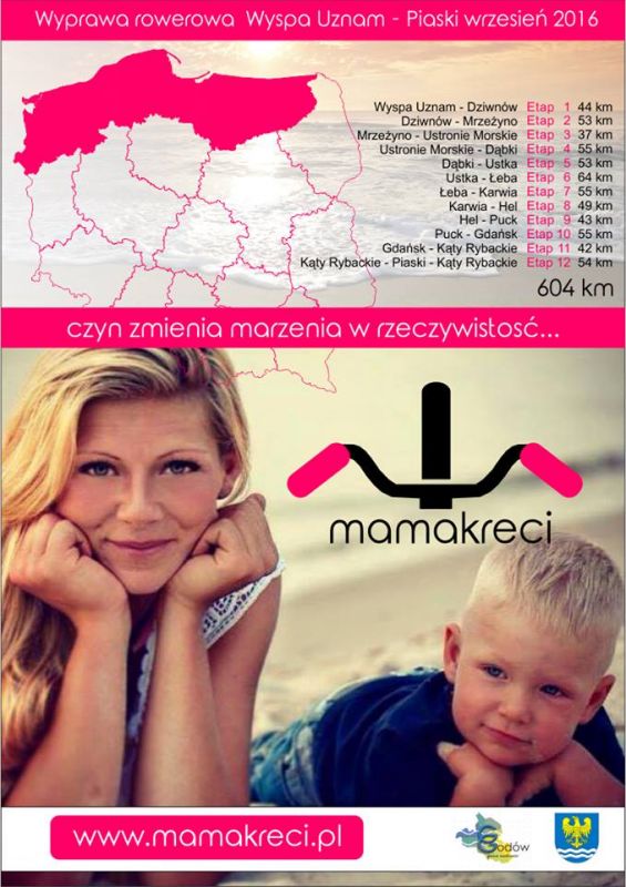 Do pokonania razem z synkiem pani Magda będzie miała 610 km. Metę wyznaczyła sobie bowiem w miejscowości Piaski koło Krynicy Morskiej. Ma nadzieję dotrzeć tam 21. września 2016 r.