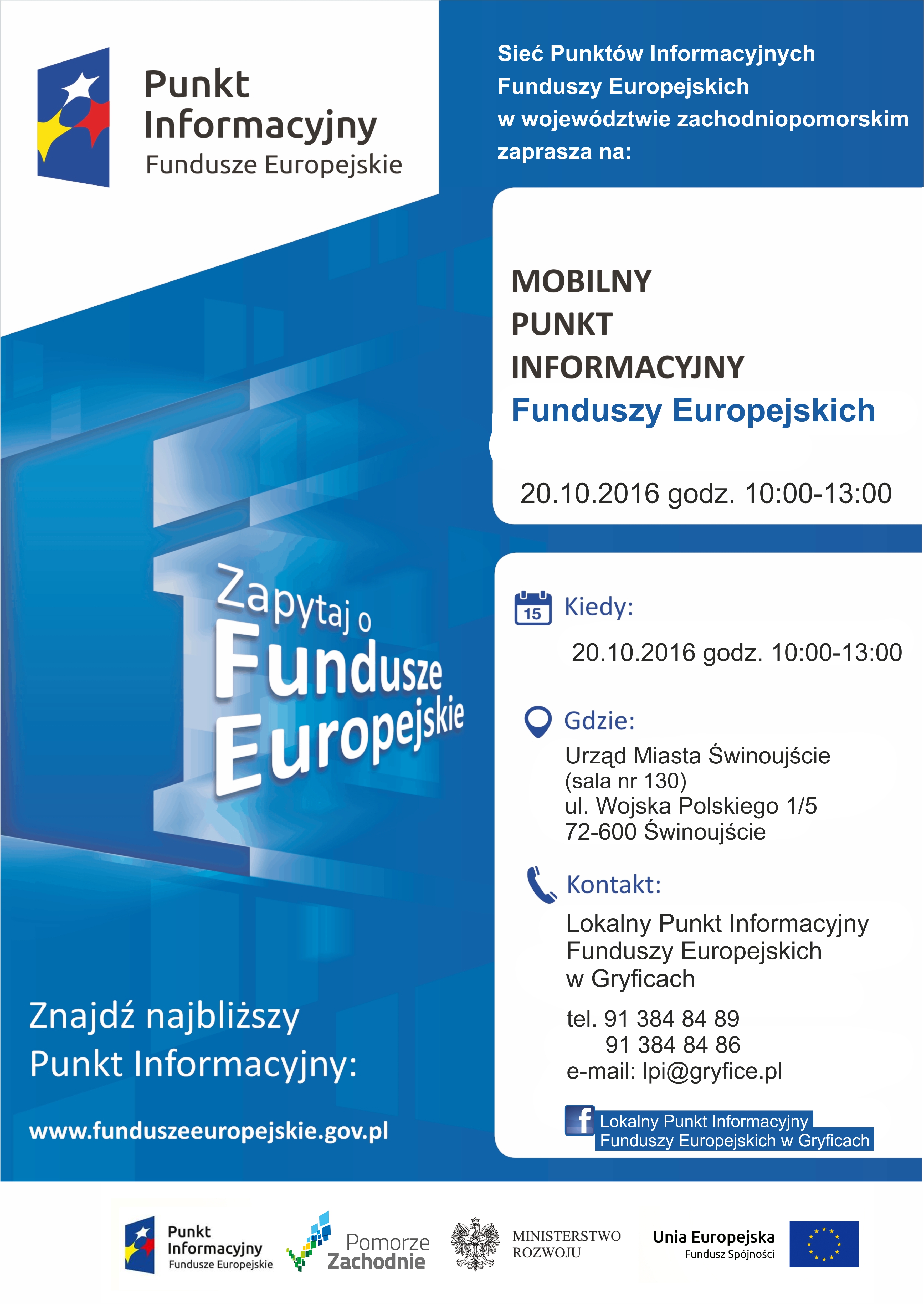 Uprzejmie informujemy, iż mieszkańcy Miasta Świnoujście w dniu 20.10.2016 r. (czwartek), w godzinach 10:00 – 13:00, w Urzędzie Miasta Świnoujście (sala 130 na I piętrze) mogą skorzystać z usług Mobilnego Punktu Informacyjnego Funduszy Europejskich