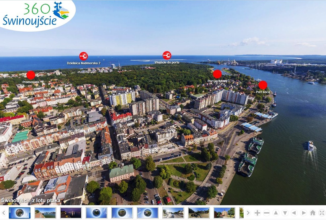 W projekt zaangażowało się także Świnoujście. W ramach pierwszego etapu wykonano 5 panoram sferycznych z drona oraz 6 panoram z ziemi. Portal swinoujscie360.eu można oglądać zarówno w standardowy sposób – korzystając z komputera, a także na smartfonie lub tablecie. Jednak prezentacja, którą nazwano wycieczką sferyczną idzie krok naprzód.