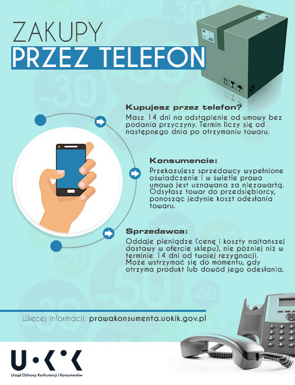 Konsumencie pamiętaj, gdy kupujesz przez telefon lub Internet, masz 14 dni na zmianę decyzji i odstąpienie od umowy. Wystarczy, że przekażesz sprzedawcy wypełnione oświadczenie. Towar odsyłasz przedsiębiorcy, a on oddaje ci pieniądze wliczając koszty najtańszej dostawy w ofercie sklepu. Ty ponosisz jedynie koszt odesłania towaru. Więcej informacji znajdziesz na prawakonsumenta.uokik.gov.pl.