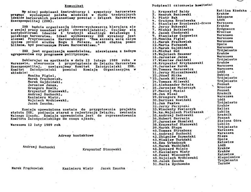 12 lutego 1989 roku w Warszawie spotkało się 51 przedstawicieli „niepokornych i niezależnych” środowisk harcerskich. Po burzliwej dyskusji, dotyczącej charakteru i nazwy tworzonej organizacji, grono inicjatorów powstania nowej organizacji zadeklarowało utworzenie i przystąpienie do Związku Harcerstwa Rzeczypospolitej.