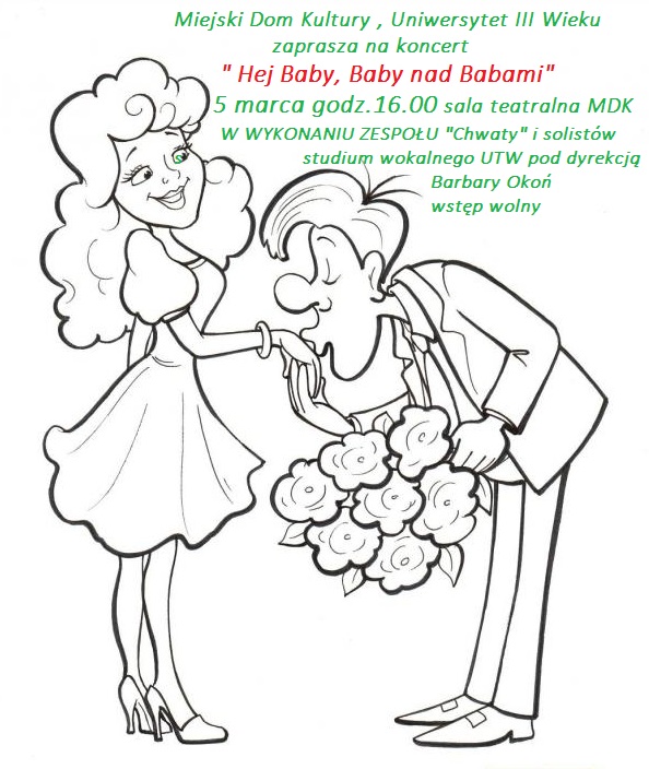 Miejski Dom Kultury Uniwersytet Trzeciego Wieku zaprasza na koncert „ Hej Baby, Baby nad Babami” w wykonaniu zespołu męskiego „Chwaty” i solistów studium wokalnego UTW pod dyrekcją Barbary Okoń. 5 marca 2017 r. (niedziela), godz. 16.00, sala teatralna MDK. Wstęp wolny.