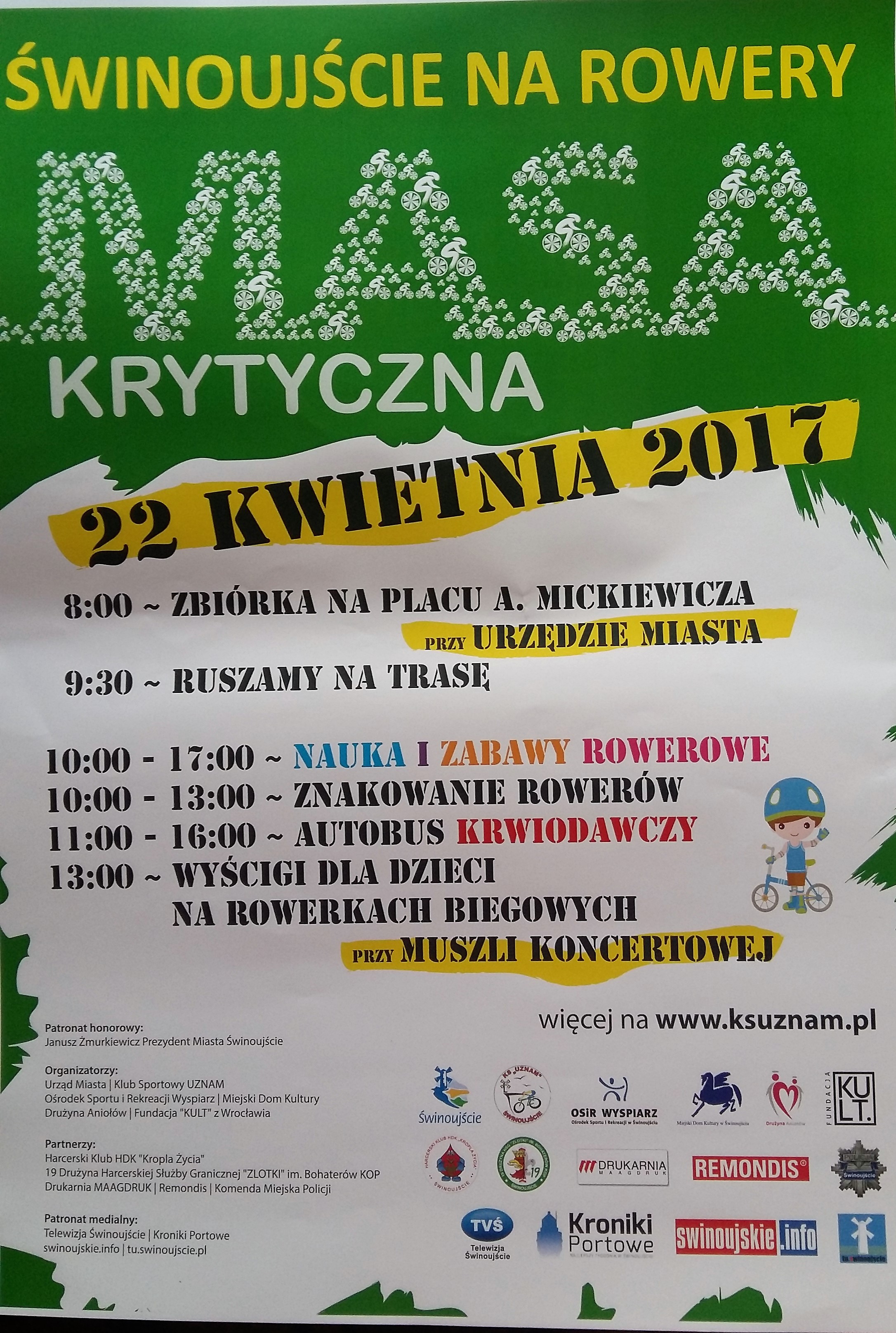 Już w najbliższą sobotę 22 kwietnia 2017 r. o godzinie 9.30 z placu przy urzędzie miasta wyruszy MASA KRYTYCZNA. Zbiórka młodszych i starszych rowerzystów o godzinie 8.00. Od godziny 10.00 zapraszamy też na plac przy muszli koncertowej na promenadzie. W programie nauka i zabawa na rowerach, znakowanie rowerów, autobus, gdzie będzie można oddać krew, a o godzinie 13.00 wyścigi rowerowe dla dzieci.