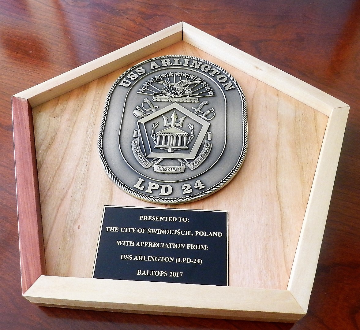 Na pamiątkę spotkania dowódca Patrick J. Hannifin wręczył naszemu prezydentowi okolicznościowy ryngraf, czyli rodzaj medalionu jednostki USS Arlington (na zdjęciu). Z kolei Janusz Żmurkiewicz podarował dowódcy album fotograficzny „Świnoujście. Miasto o wielu obliczach”, pamiątkowego srebrnego dukata „Wyspiarz” oraz obraz ze zdjęciem zimorodka, jednego z przedstawicieli świnoujskiej fauny, którego autorem jest świnoujścianin Krzysztof Chomicz.
