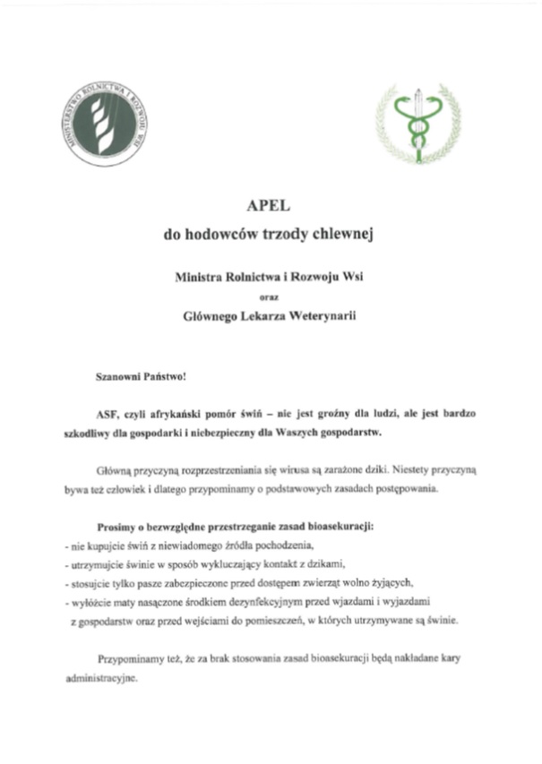 UWAGA ! Dotyczy afrykańskiego pomoru świń (ASF)