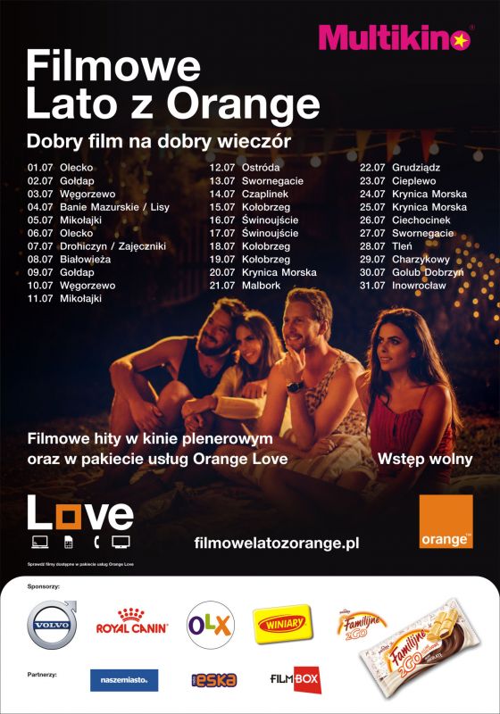 Rozrywka z Orange i Multikinem dotrze nad Bałtyk i w Karkonosze, na Mazury i Kaszuby, na Zamojszczyznę i na Podkarpacie. W najpiękniejszych zakątkach Polski niemal nieprzerwanie przez trzy miesiące trwać będzie prawdziwa kinowa przygoda. Świnoujście i Cisna, Karpacz i Kołobrzeg, Białowieża i Białka Tatrzańska – to niektóre lokalizacje, do których zawita Filmowe Lato z Orange i Multikinem. W ciągu 84 dni odbędą się tam pokazy największych hitów festiwalowych, wakacyjnych evergreenów, tytułów wprawiających w doskonały nastrój.Już teraz zapraszamy kinomanów na bezpłatne pokazy w miastach, miasteczkach i popularnych kurortach wakacyjnych. Rozpoczynające się po zmierzchu projekcje kina plenerowego zostaną zaprezentowane w najlepszej jakości obrazu i dźwięku, którą gwarantuje Multikino, operator jednej z największych sieci multipleksów w Polsce.