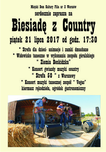 Miejski Dom Kultury Filia na Warszowie serdecznie zapraszamy mieszkańców i turystów na Wakacyjną Biesiadę z Country. Zaczynamy w piątek 21 lipca 2017 r. od godz.17.00 na placu rekreacyjnym przy MDK ulica Sosnowa18. Wstęp wolny.
