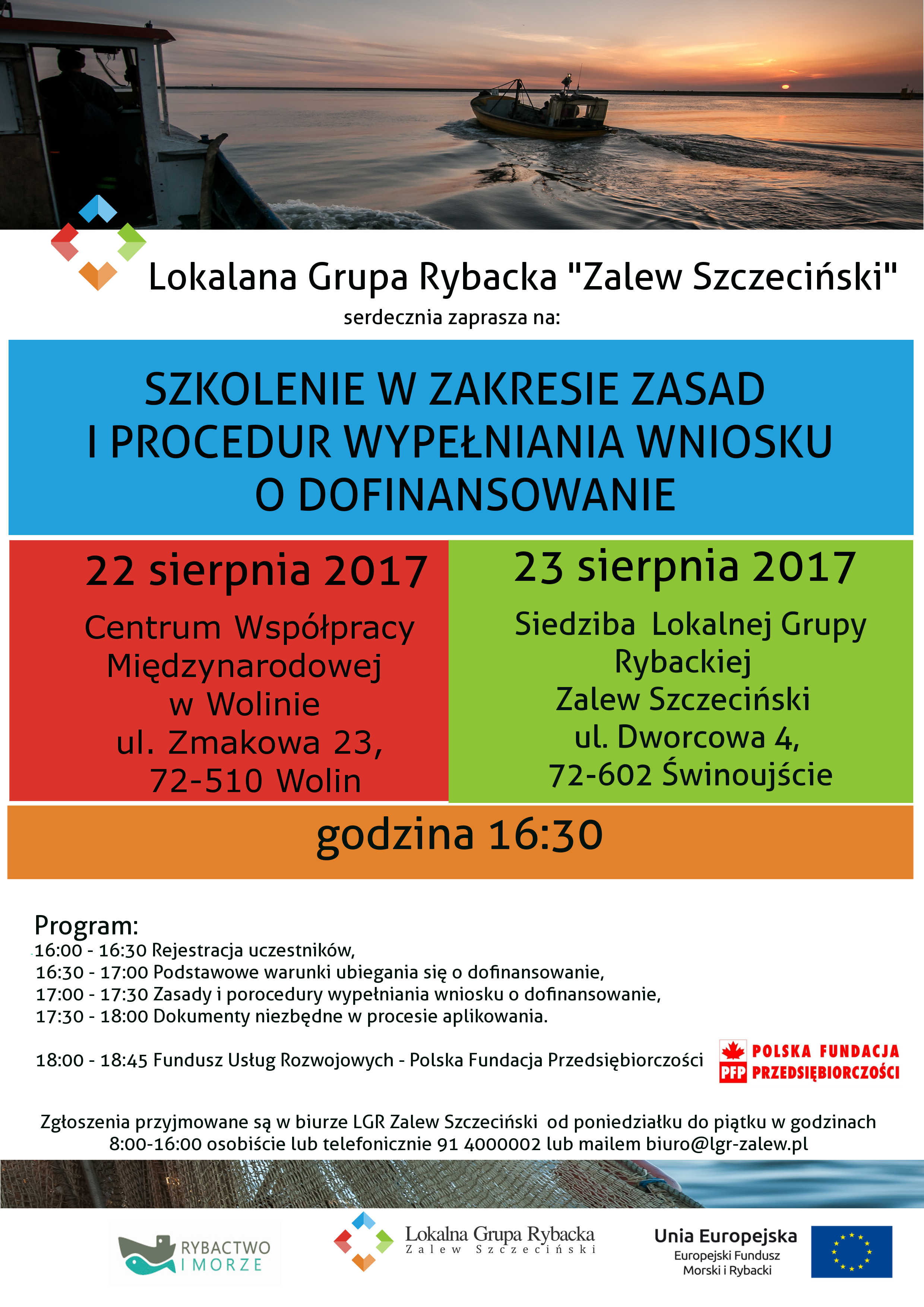 LGR zaprasza na szkolenie w zakresie zasad i procedur wypełniania wniosku o dofinansowanie. Szkolenia odbędą się 22 sierpnia 2017 r. w Wolinie, a 23 sierpnia 2017 r. w Świnoujściu. Zgłoszenia przyjmowane są biurze LGR. Zobacz więcej.