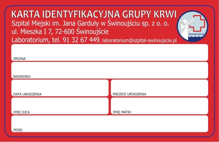 Szpital Miejski im. Jana Garduły w Świnoujściu sp. z o.o. informuje, że od 19. Września 2017 r. w szpitalnym laboratorium można będzie dokonać oznaczenia grupy krwi i uzyskać jej wynik utrwalony na krew karcie. Karta ta jest wyprodukowana na wzór karty bankomatowej i innych plastikowych dokumentów i każdy z nas powinien ją zawsze mieć przy sobie.