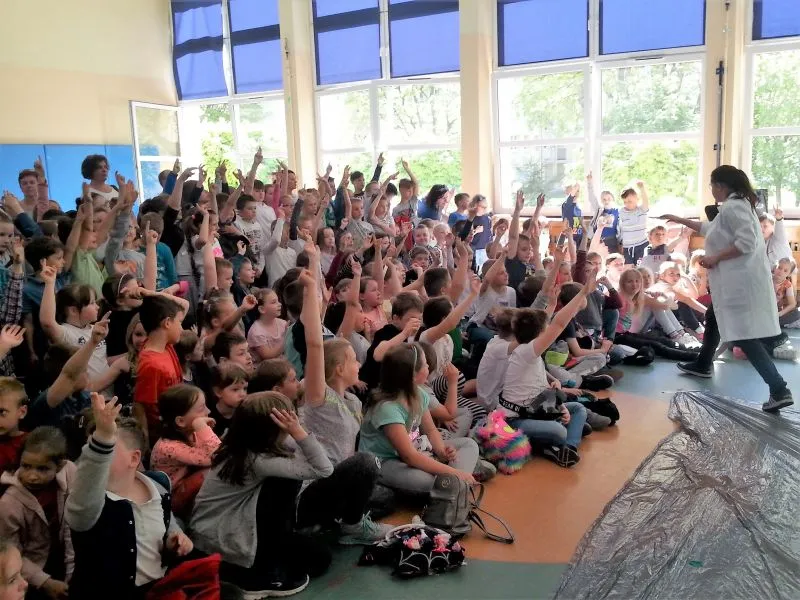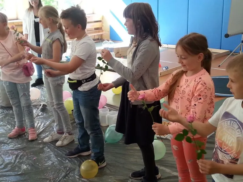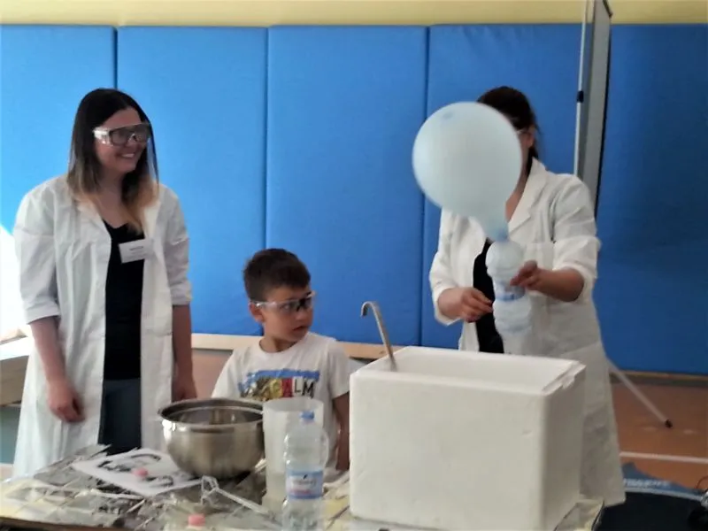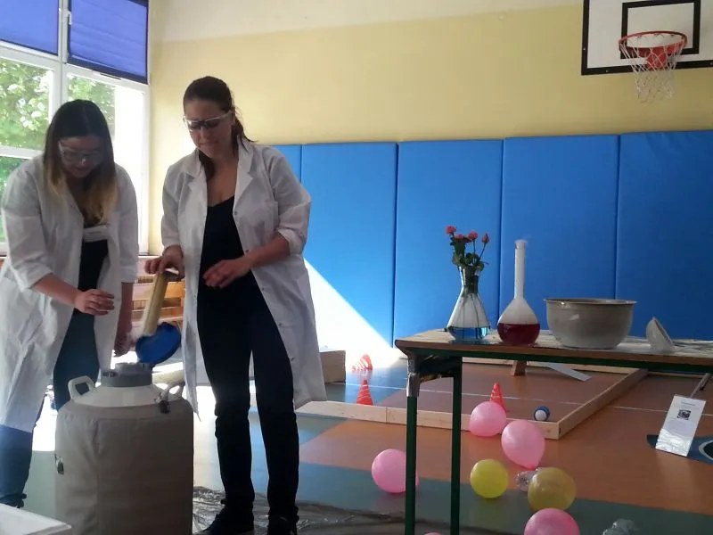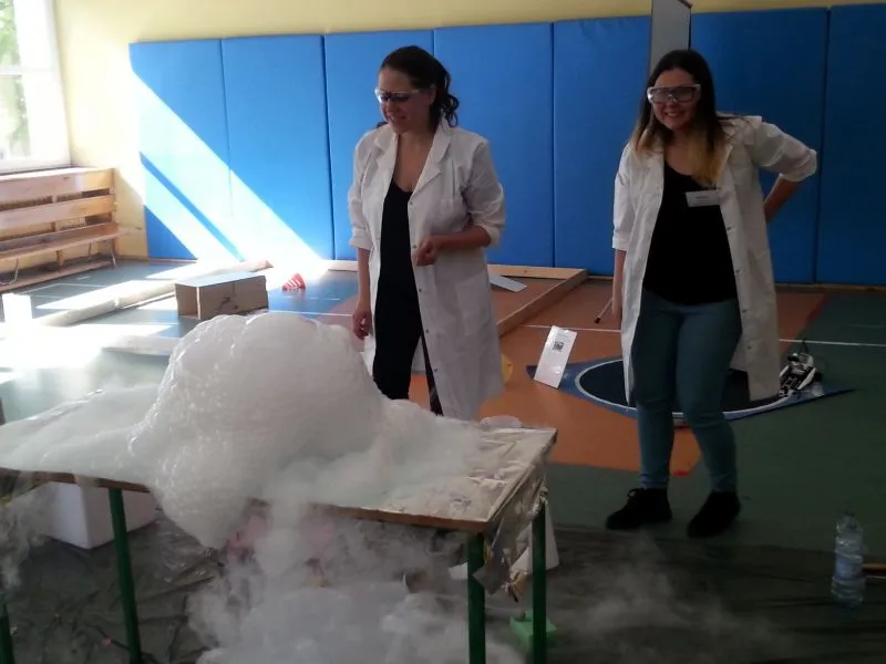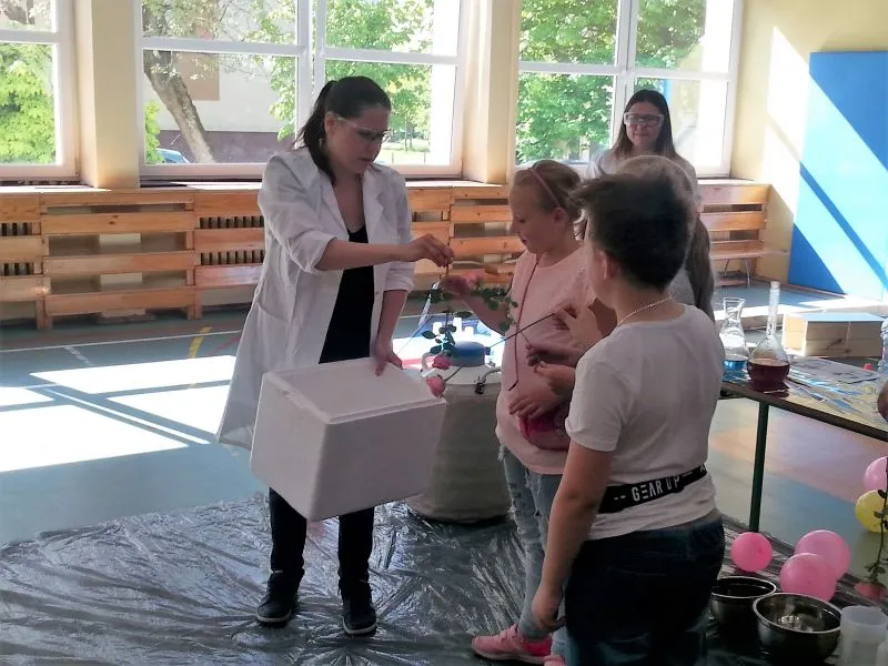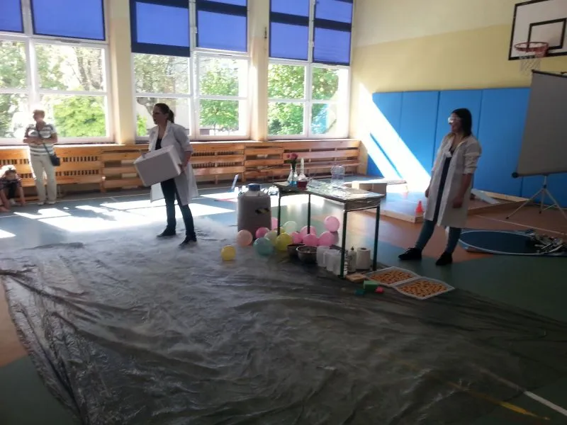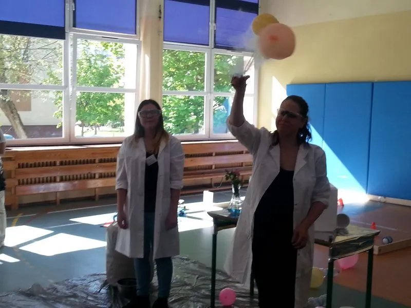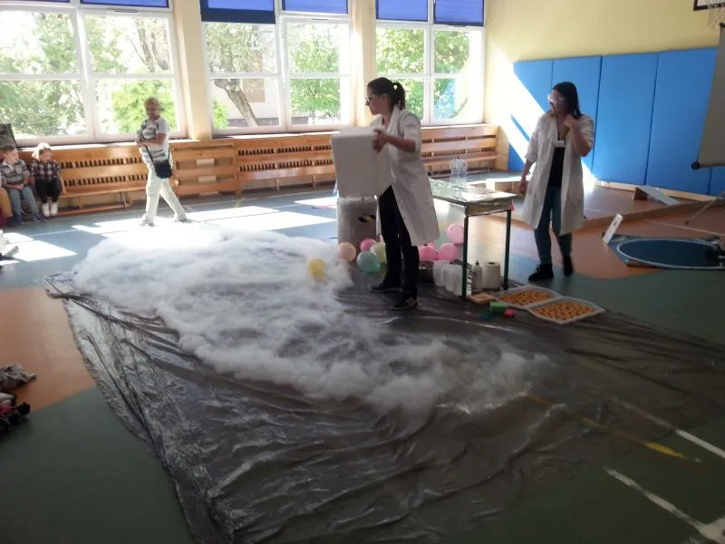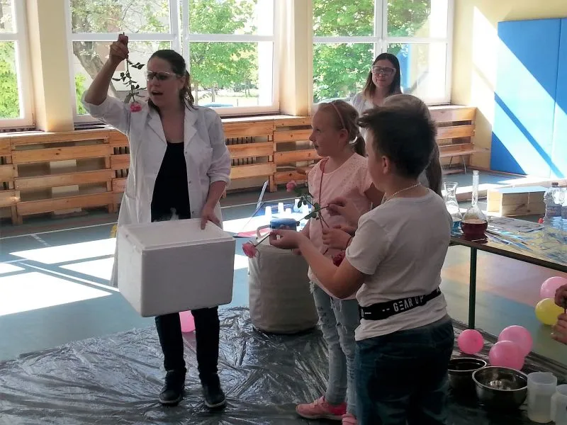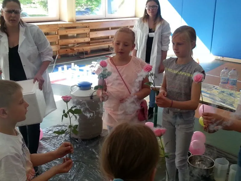 Każdy dzień programowania rozpoczyna się pokazem naukowym, który bacznie obserwują wszyscy uczniowie naszej szkoły. Dużym zainteresowaniem cieszyło się doświadczenie, do którego wykorzystano substancję o ekstremalnie niskiej temperaturze, bo aż -200°C! Oprócz tego dzieci mogły zobaczyć ciekawe zabiegi badawcze z udziałem ciekłego azotu, a chwilę później podziwiać wyniki tych doświadczeń, którymi było m.in. powietrze w formie cieczy, mgła Harry'ego Pottera, czy imponujące, kruche róże. Chętni uczniowie zgłaszali się do doświadczenia, w którym mogli spróbować wbić gwóźdź bananem. To tylko zaledwie kilka