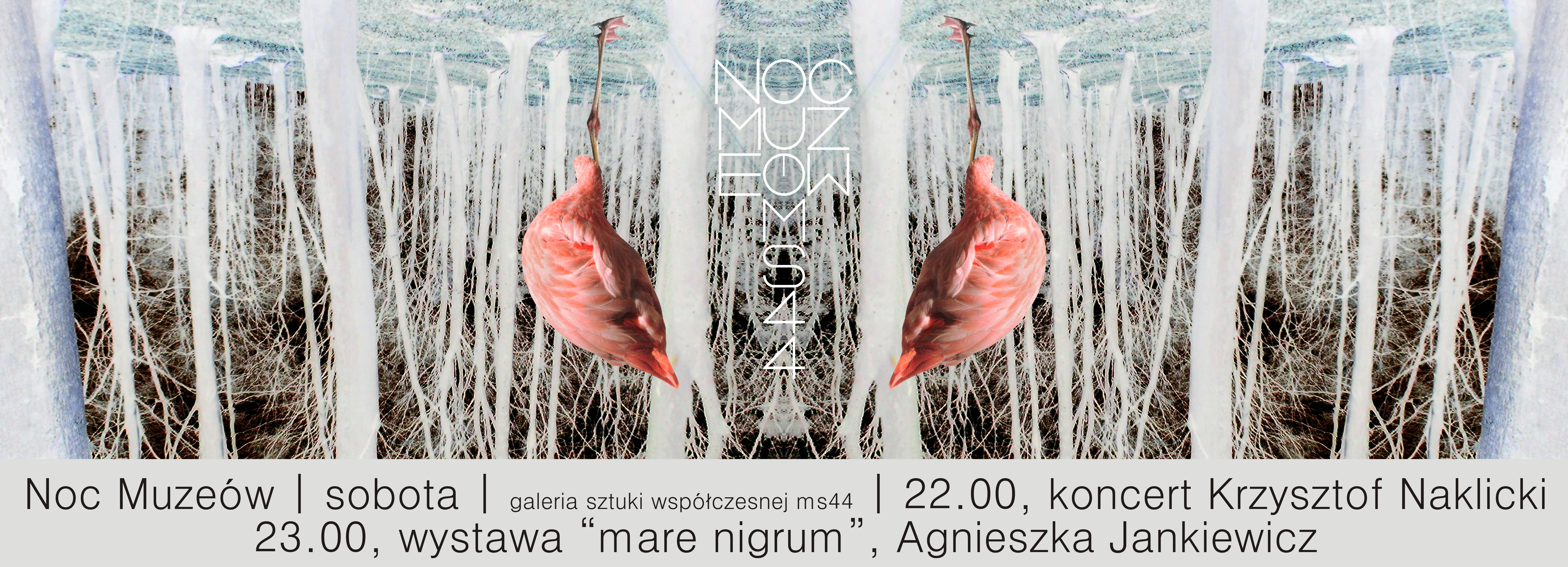 Po wysłuchaniu koncertu, będzie można obejrzeć wystawę świnoujskiej artystki Agnieszki Jankiewicz, „mare nigrum”, której aranżacja powoduje że przestrzeń wypełniona rozrzeźbioną grafiką szczególnie efektownie wygląda podczas nocy. Zapraszamy 19 maja w sobotę, od godziny 22.00 do odwiedzenia galerii ms44 przy ulicy Armii Krajowej 13. Wstęp wolny.