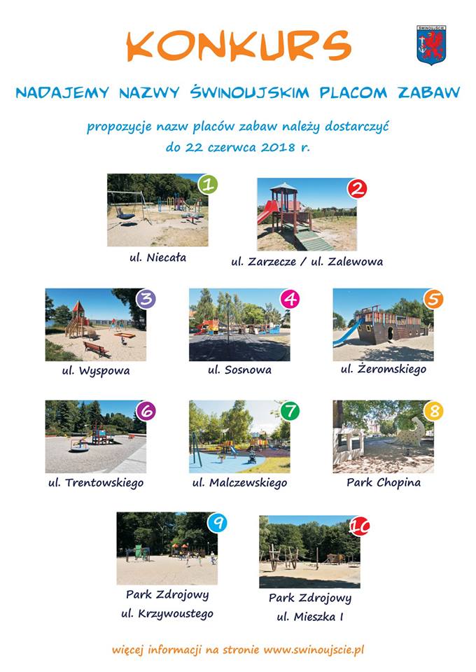 W Świnoujściu jest 10 miejskich placów zabaw. Do tej pory identyfikowane były według położenia; przy policji, przy muszli koncertowej, przy Malczewskiego itd. Wkrótce to się zmieni. W pierwszym etapie konkursu na nazwy placów zabaw propozycje zgłaszają przedszkolaki i najmłodsi uczniowie świnoujskich szkół. Spośród nich w głosowaniu te ostateczne nazwy wybiorą mieszkańcy.