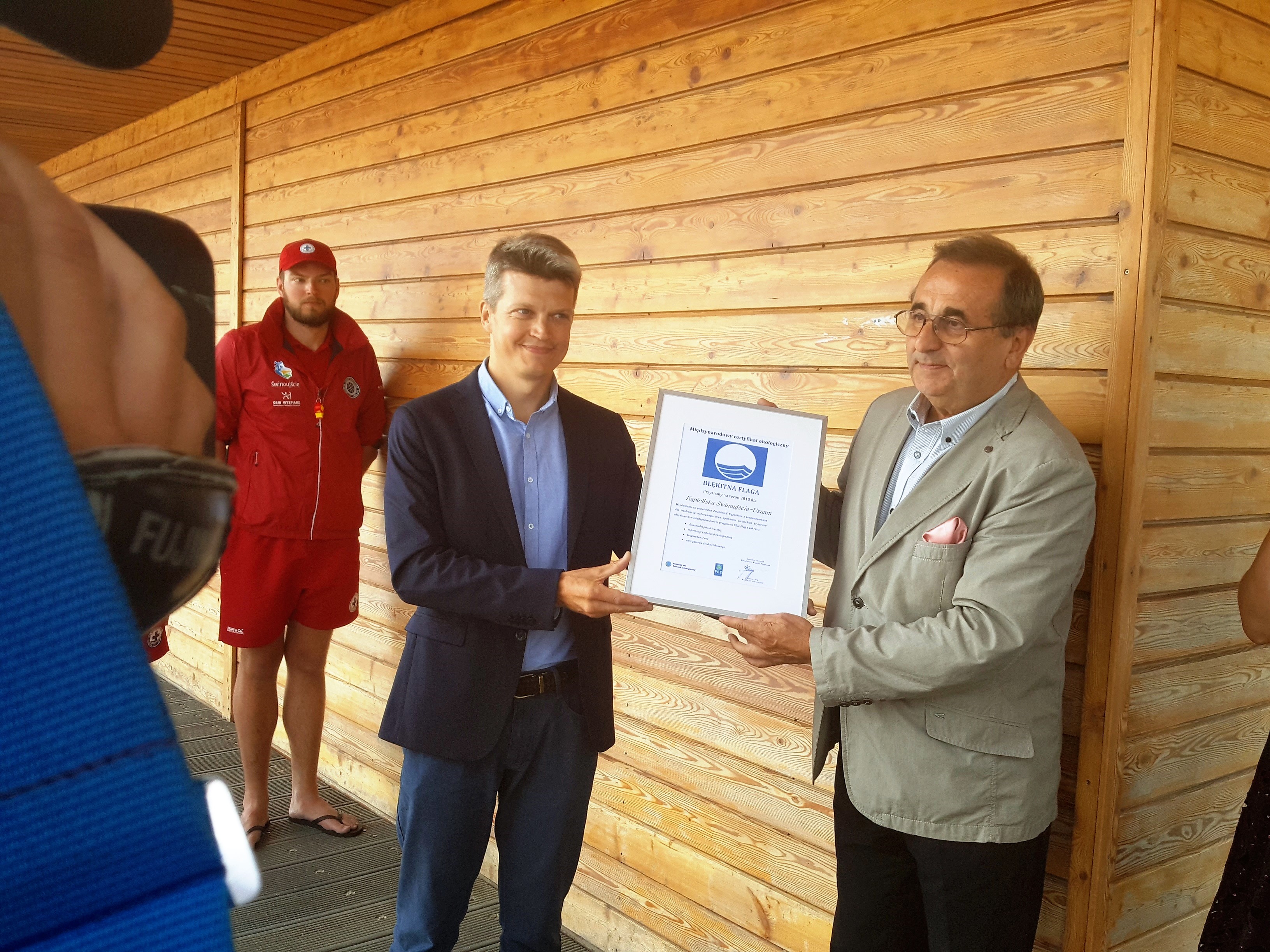 - Stale podnosimy wymagania w stosunku do kąpielisk – poinformował wręczając certyfikat Jarosław Szczygieł – koordynator Programu Błękitna Flagaw Polsce. - W tym roku w naszym kraju przyznano Błękitną Flagę 23 plażom, to o 8 mniej niż przed rokiem.