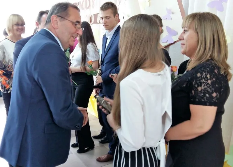 3. Adam Piaseczny z Gimnazjum Publicznego nr 2, laureat konkursu języka angielskiego; pani Ewa Rucińska i pan Marcin Michalczak;