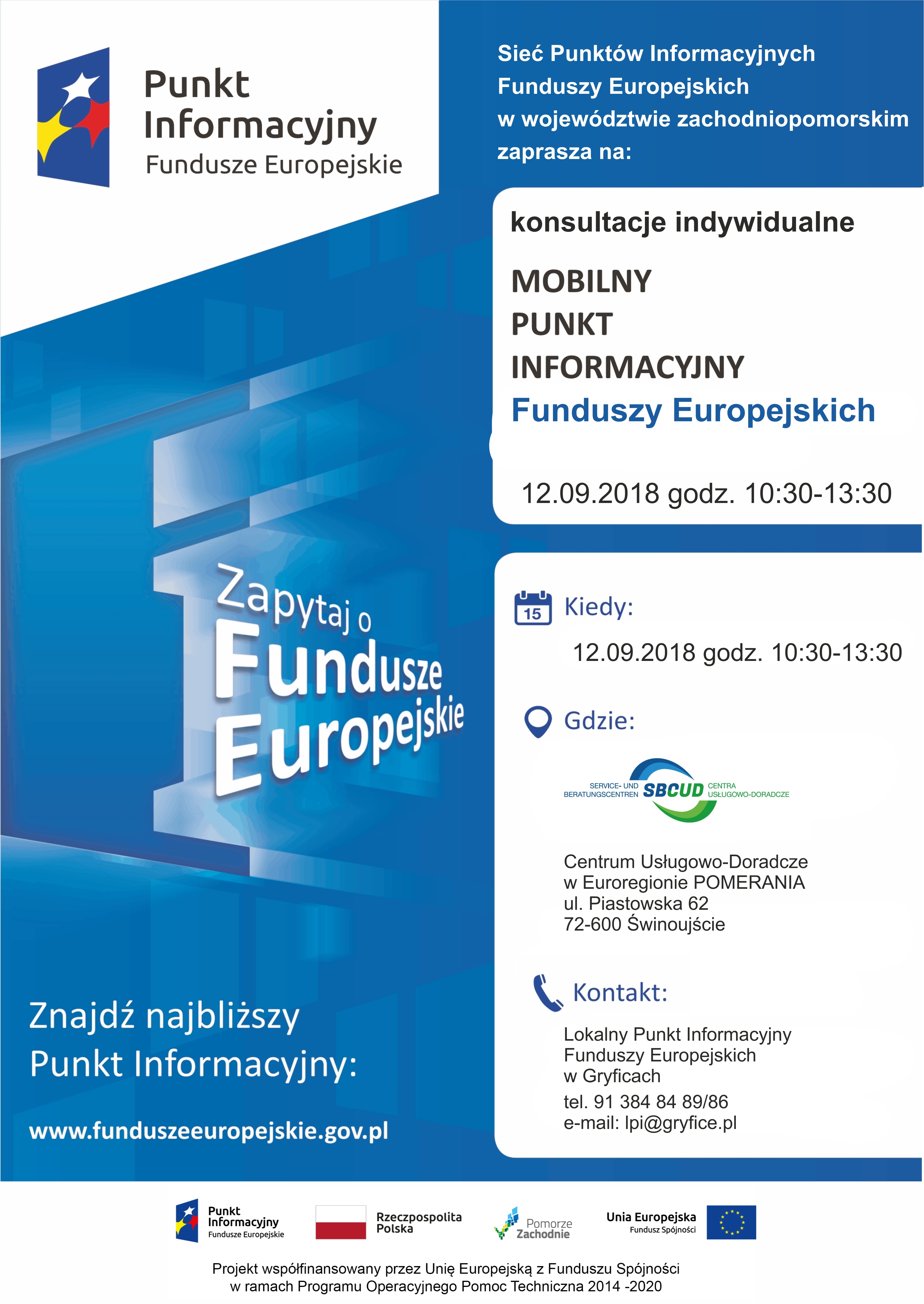 Przypominamy, że w siedzibie Centrum Usługowo-Doradczego przy ul. Piastowskiej 62 uruchomiony został Punktu Informacyjnego Funduszy Europejskich w ramach Mobilnego Punktu Informacyjnego. Stały dyżur Punktu odbywa się każdą drugą środę miesiąca.Najbliższy dyżur już jutro 12 września 2018,godz. 10.30 – 13.30. W punkcie można uzyskać informacje na temat: