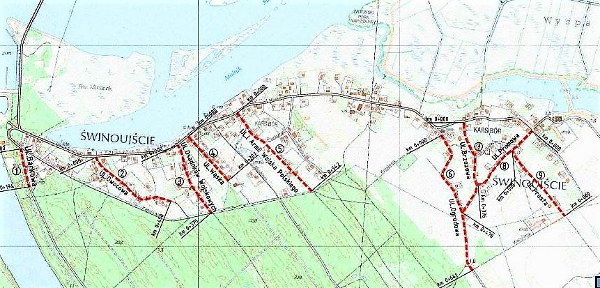 W Karsiborze utwardzone zostaną: Barkowa (194 metry), Owocowa (450 metrów), Osadników Wojskowych (377 metrów), Wąska (300 metrów), I Armii Wojska Polskiego (543 metry), Ogrodowa (641 metrów), Brzozowa (474 metry), Prosta (419 metrów) oraz Promowa (376 metrów). Na Warszowie – ulica Wrzosowa (180 metrów) i w Przytorze ulica Polna (80 metrów).